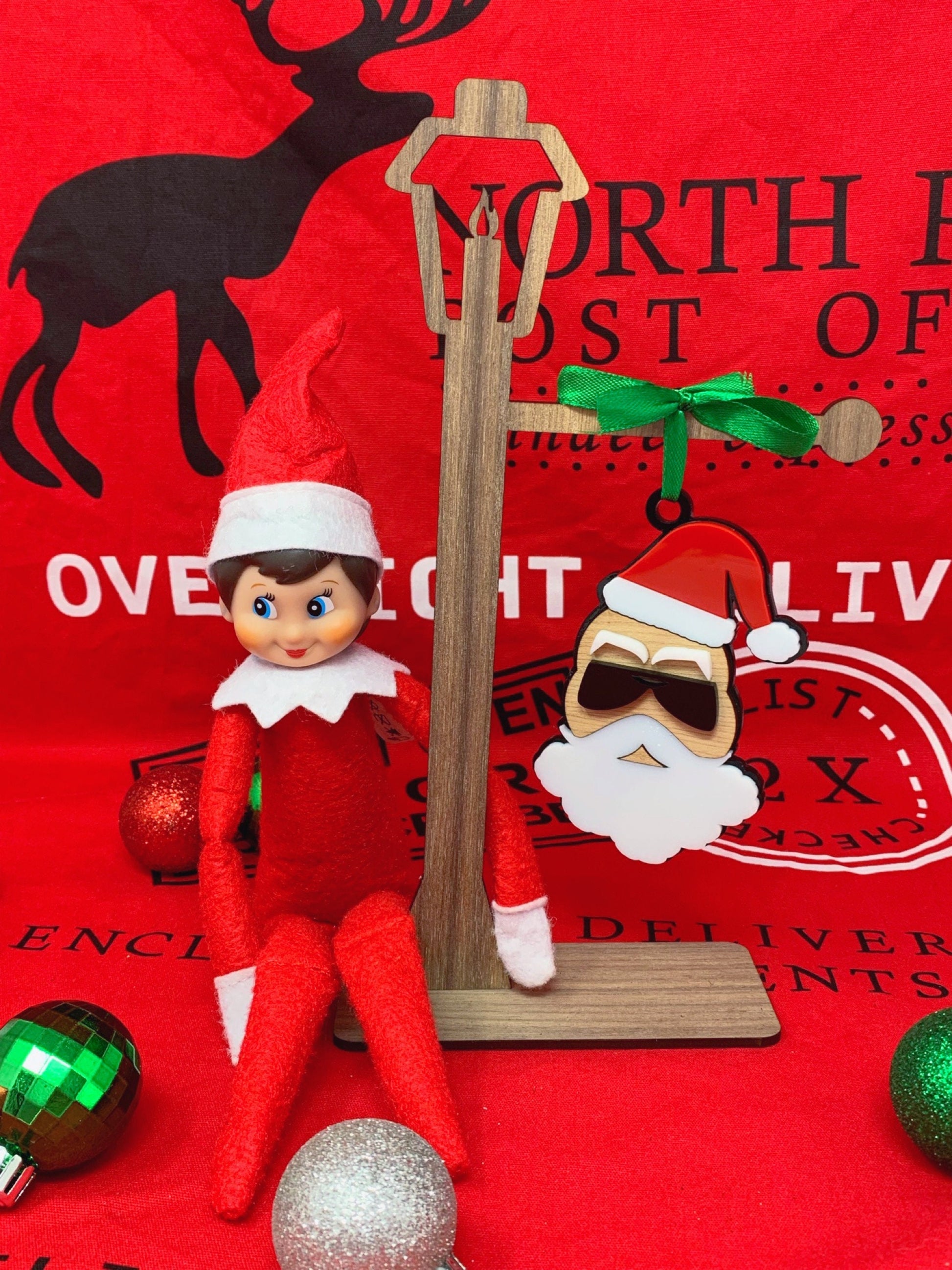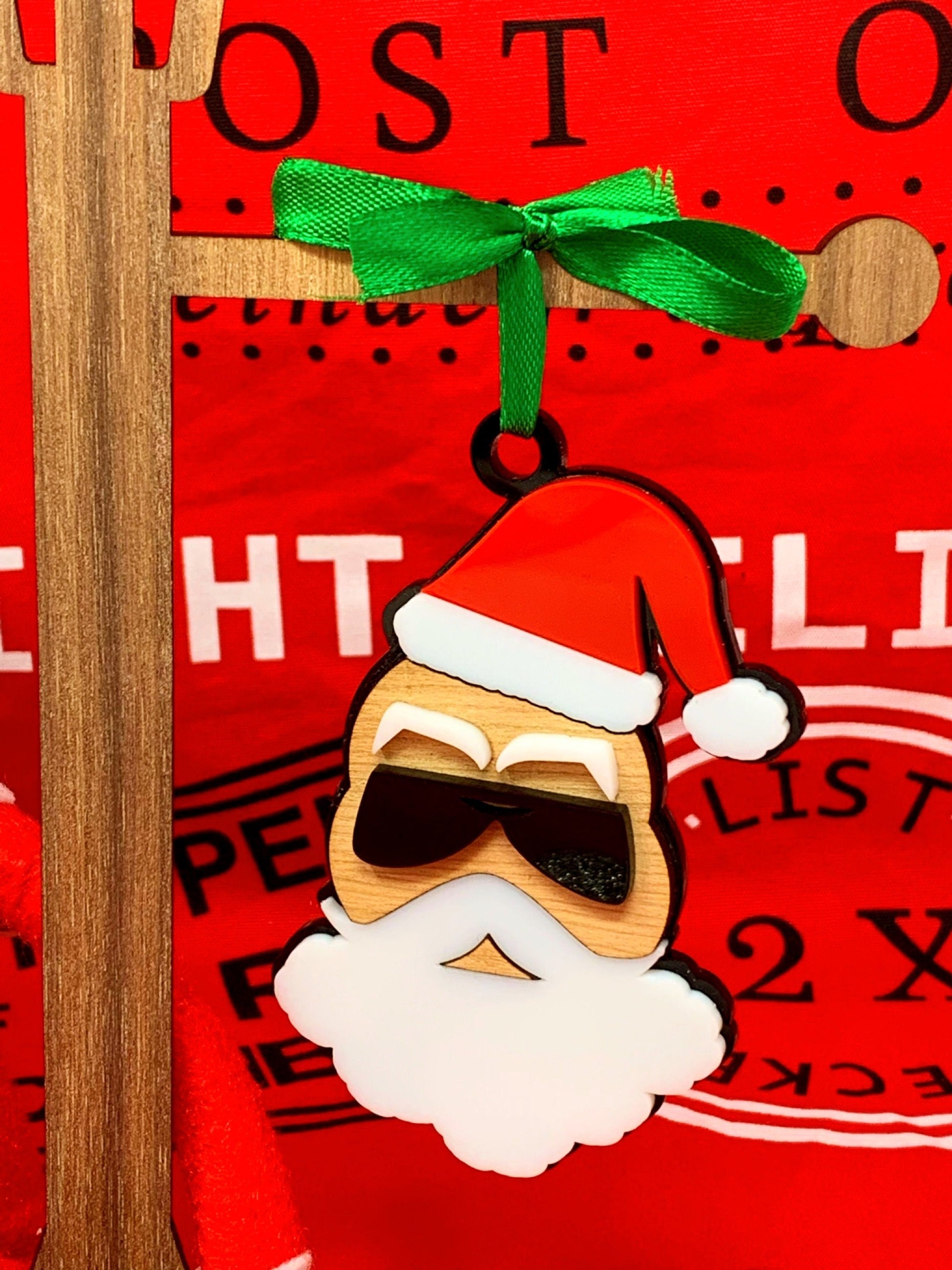 Santa is approximately 4" tall x 2.5" wide, and made from different layers of colored acrylic and wood of your choice. The options included are cherry or walnut for the face, and also the color of Santas sunglasses (black, white, or silver glitter). Each piece is cut to fit nicely together.