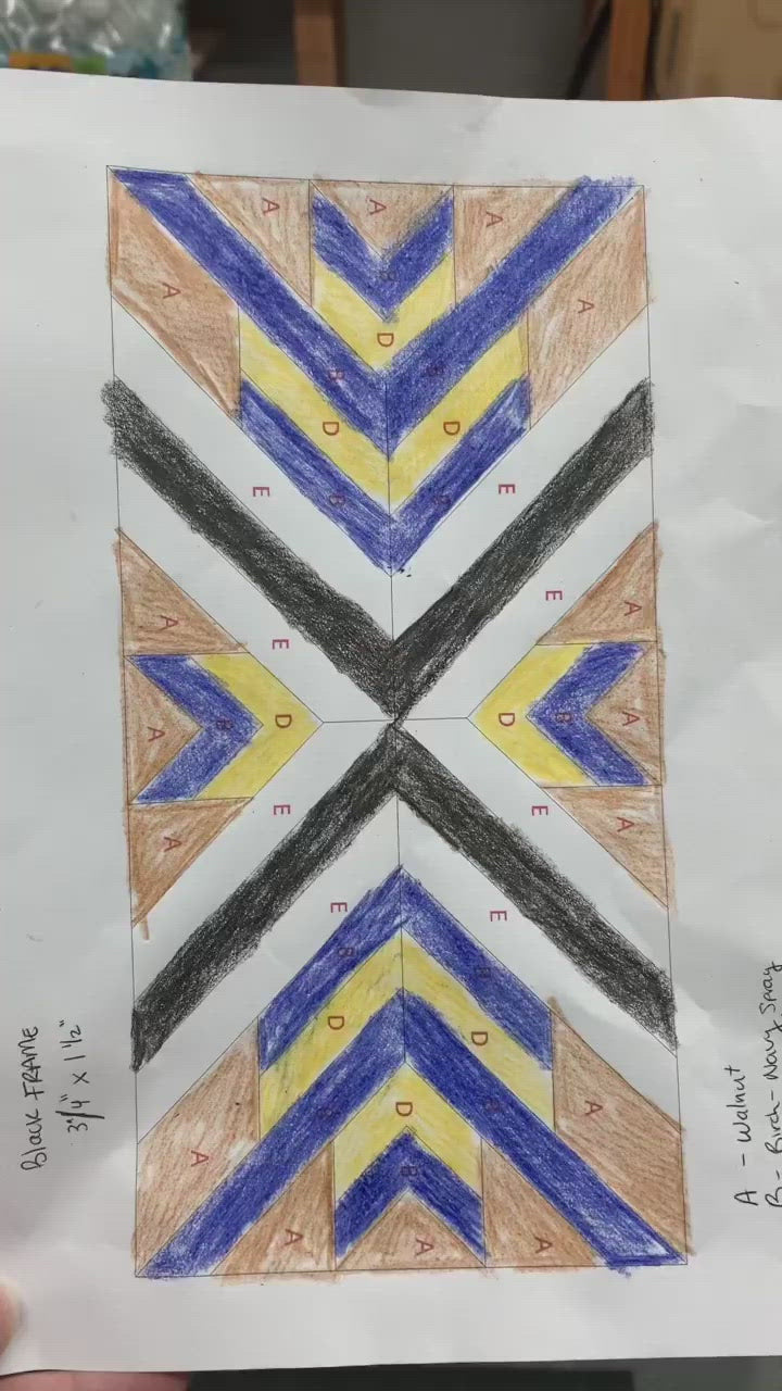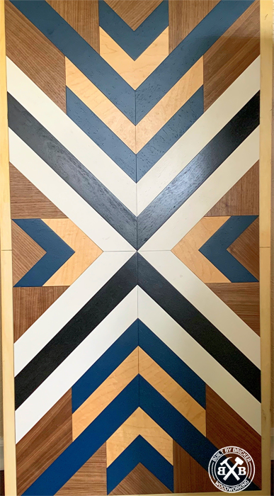 - Materials used are 1/2 inch plywood backer and 1/4 pieces of various (birch, maple, walnut, cherry) plywoods. Included Hard Maple frame can be painted, stained, or left natural. An 18" wall cleat hanger will be installed on the back of the art piece to allow it to be easily hung in its new home.