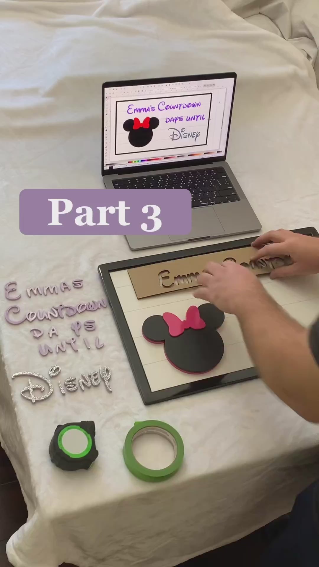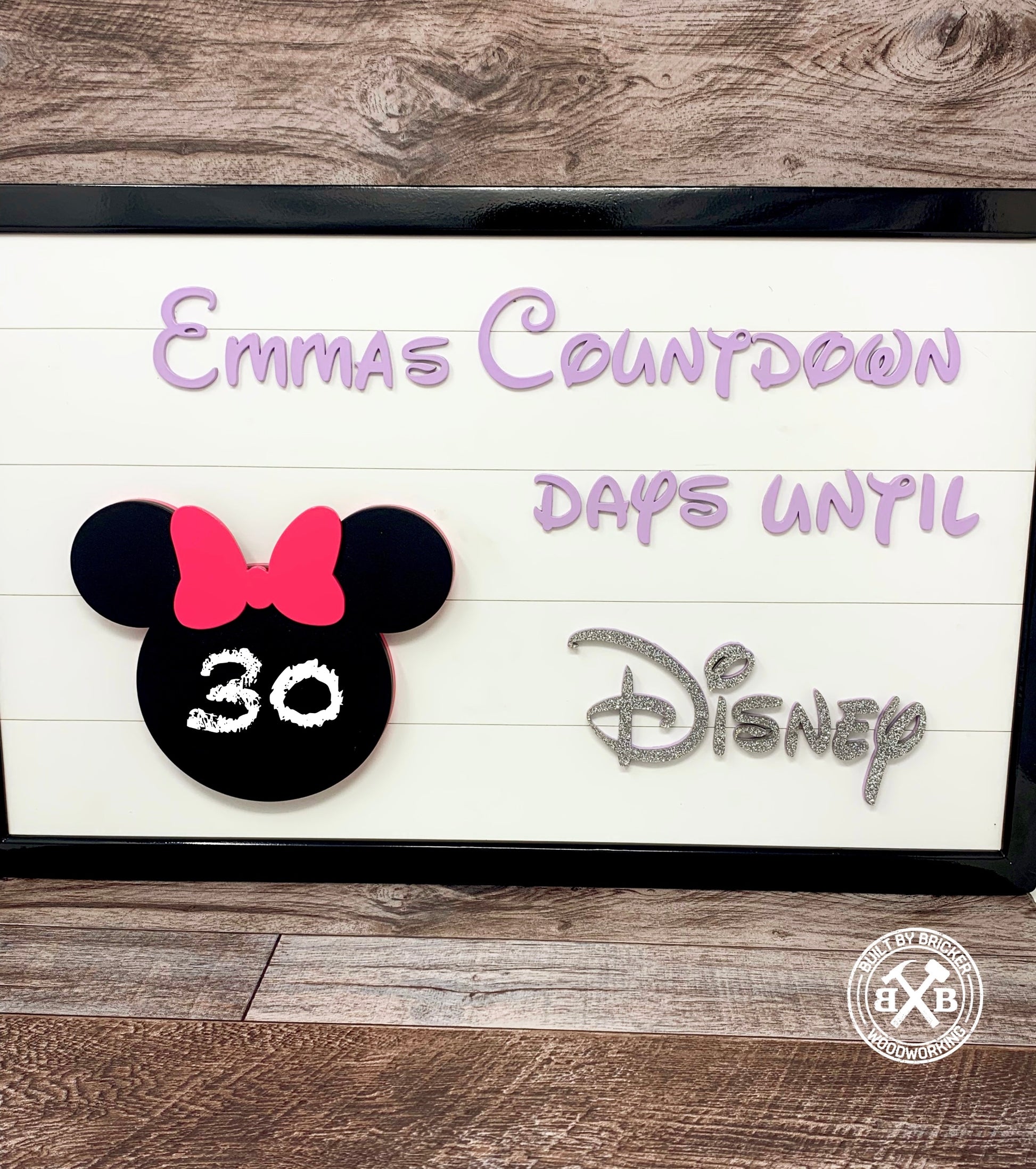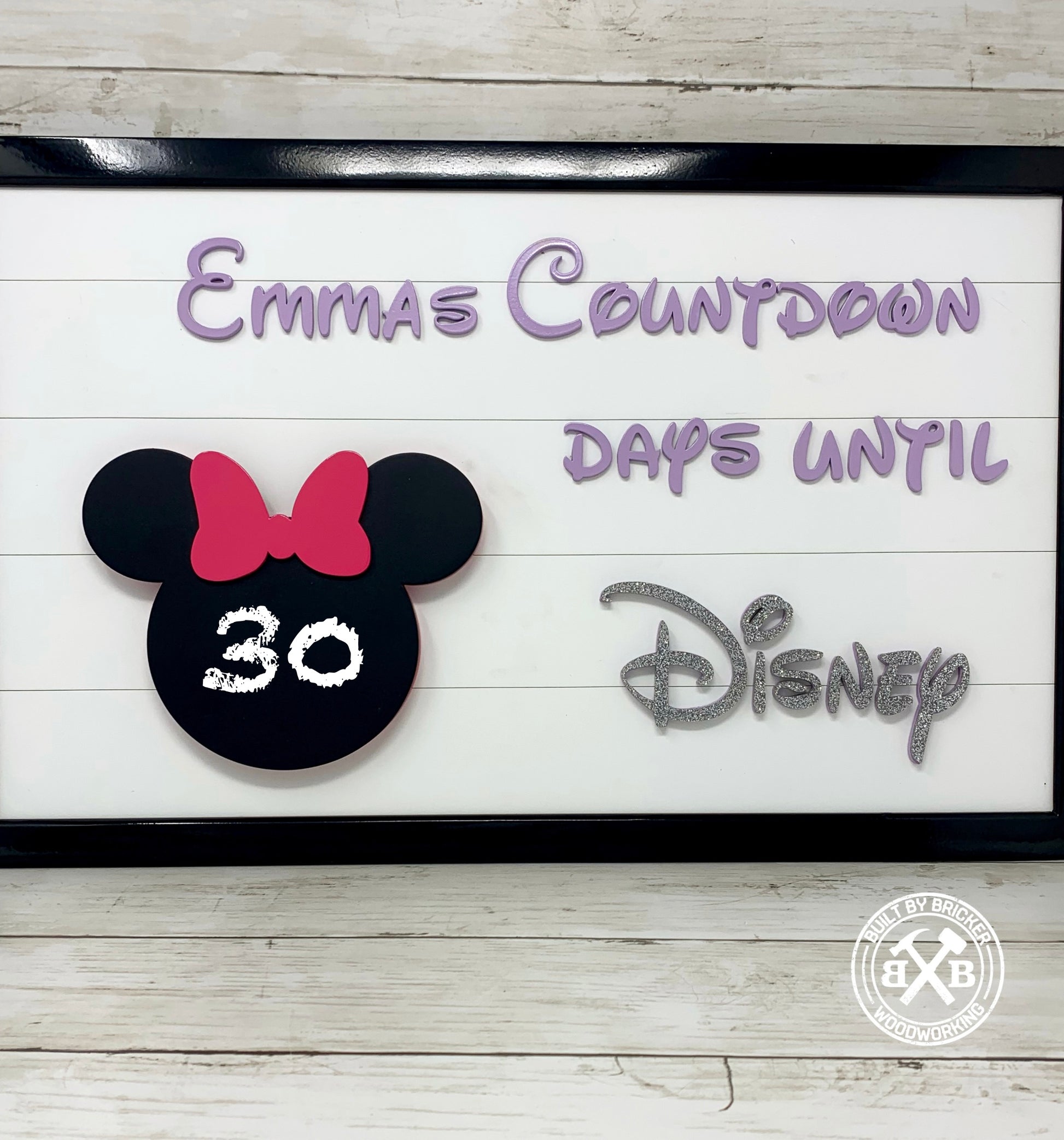 This custom decorative sign has incredible layered details and several personalization options. The Minnie/Mickey Head top layer is painted in chalkboard paint and will help kiddos to countdown until their trip!