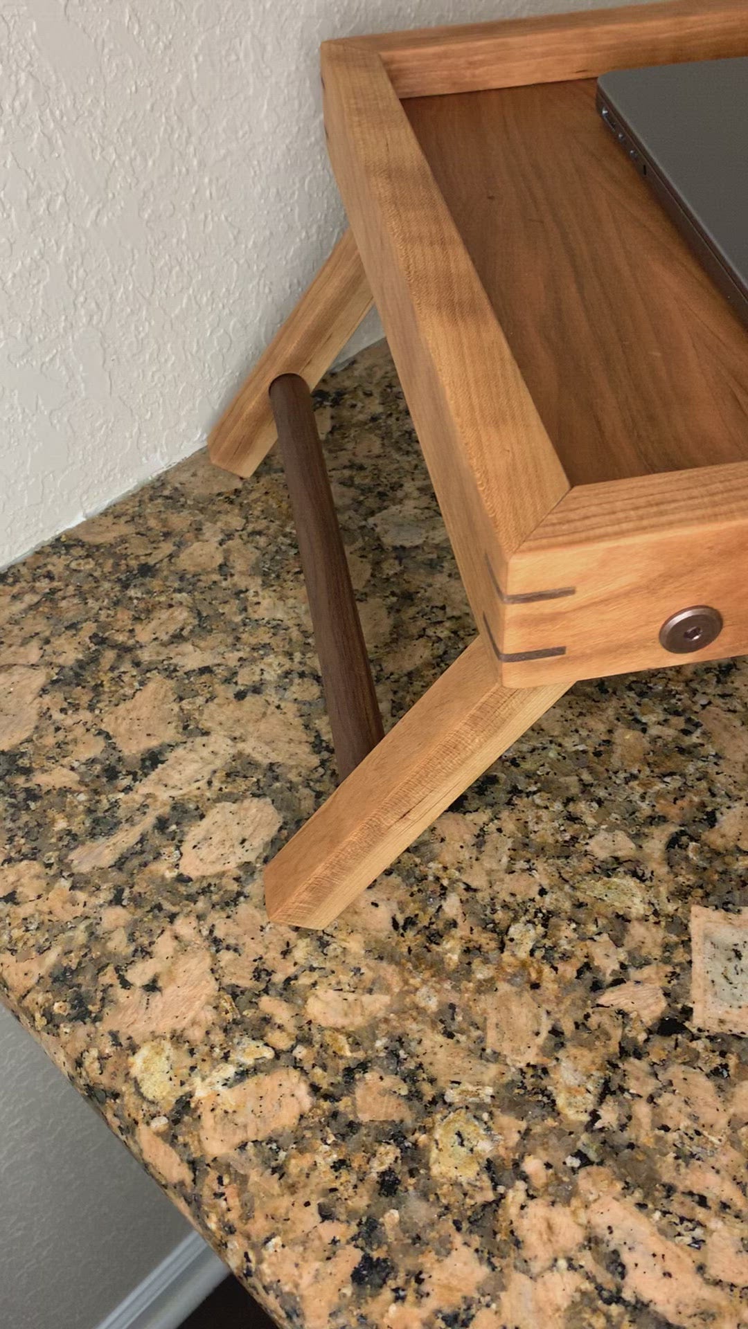 Custom laptop/breakfast in bed tray. This is a must for anyone working from home! It also conveniently doubles as a breakfast in bed tray when you need some R & R! The legs fold up and tuck underneath the tray for easy storage when not in use. The image shown is made from cherry hardwood and has walnut spline accents.