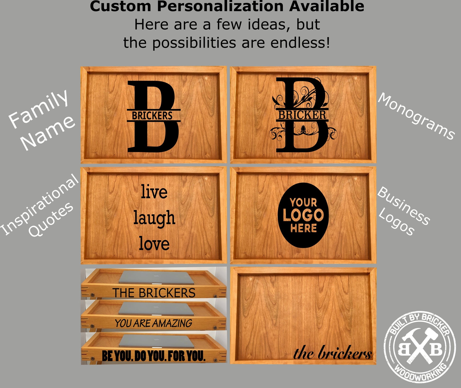 - The overall outside dimensions are approximately 20" long x 13" wide x 2" tall. Interior tray dimensions are approximately 18.5" long x 11.5 wide. It comfortably fits most laptops with enough room to spare for a phone and a bottle of water. This is handcrafted from real hardwood that will last a lifetime, if taken care of properly. All orders are custom made! Different types of wood can be chosen (walnut, maple, cherry) as well as personalization options (business logo, family names, inspirational quotes, etc.). The options are endless, please contact me to discuss your vision. Logos can also be engraved, but will require a custom quote. With all designs, a proof will be sent to you for final approval!