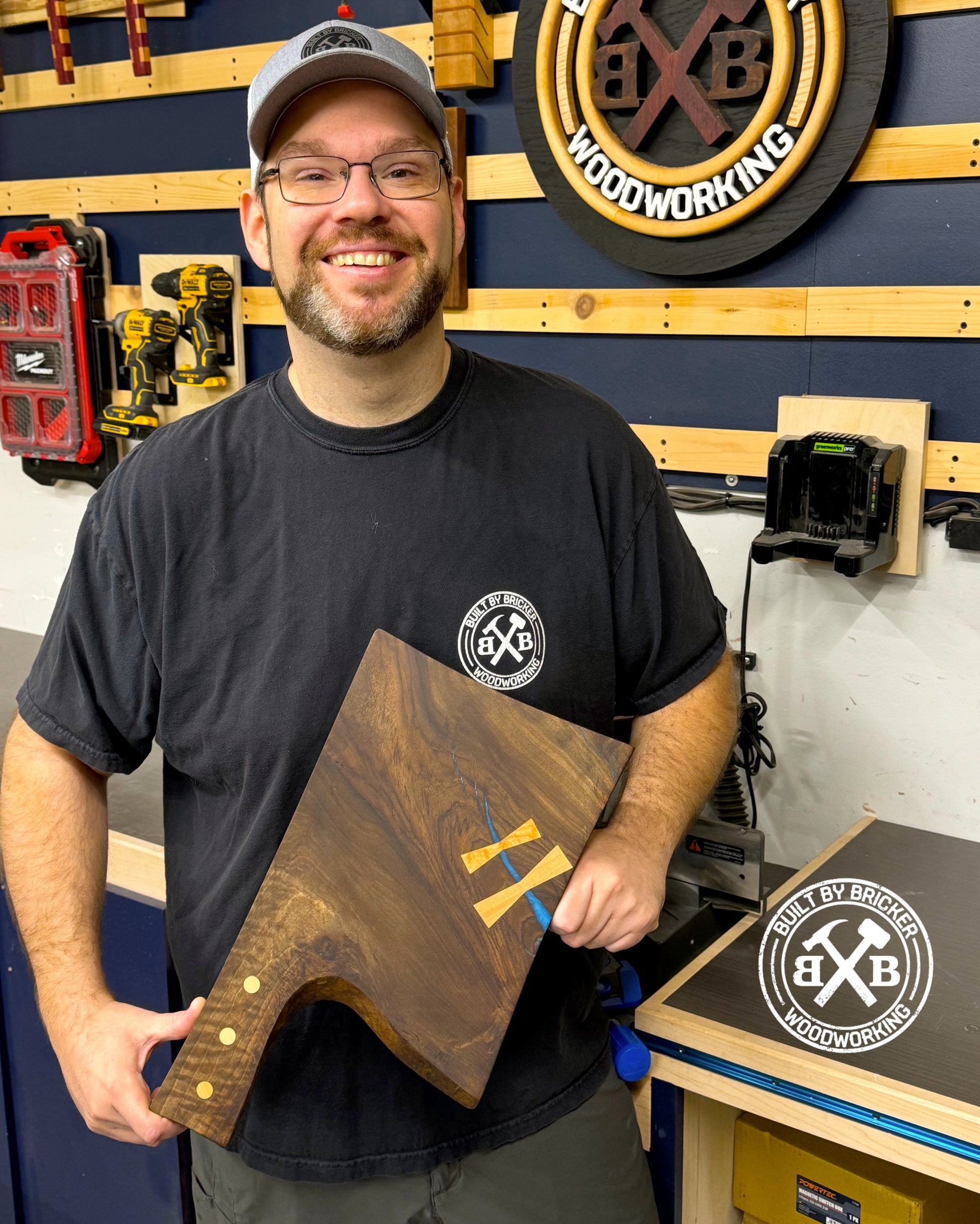 Across the face of the board, a natural crack has been stabilized and highlighted with blue epoxy, secured by a pair of curly maple bowties. These details don’t just add strength, they turn a natural imperfection into a standout design feature that tells the story of the wood.
