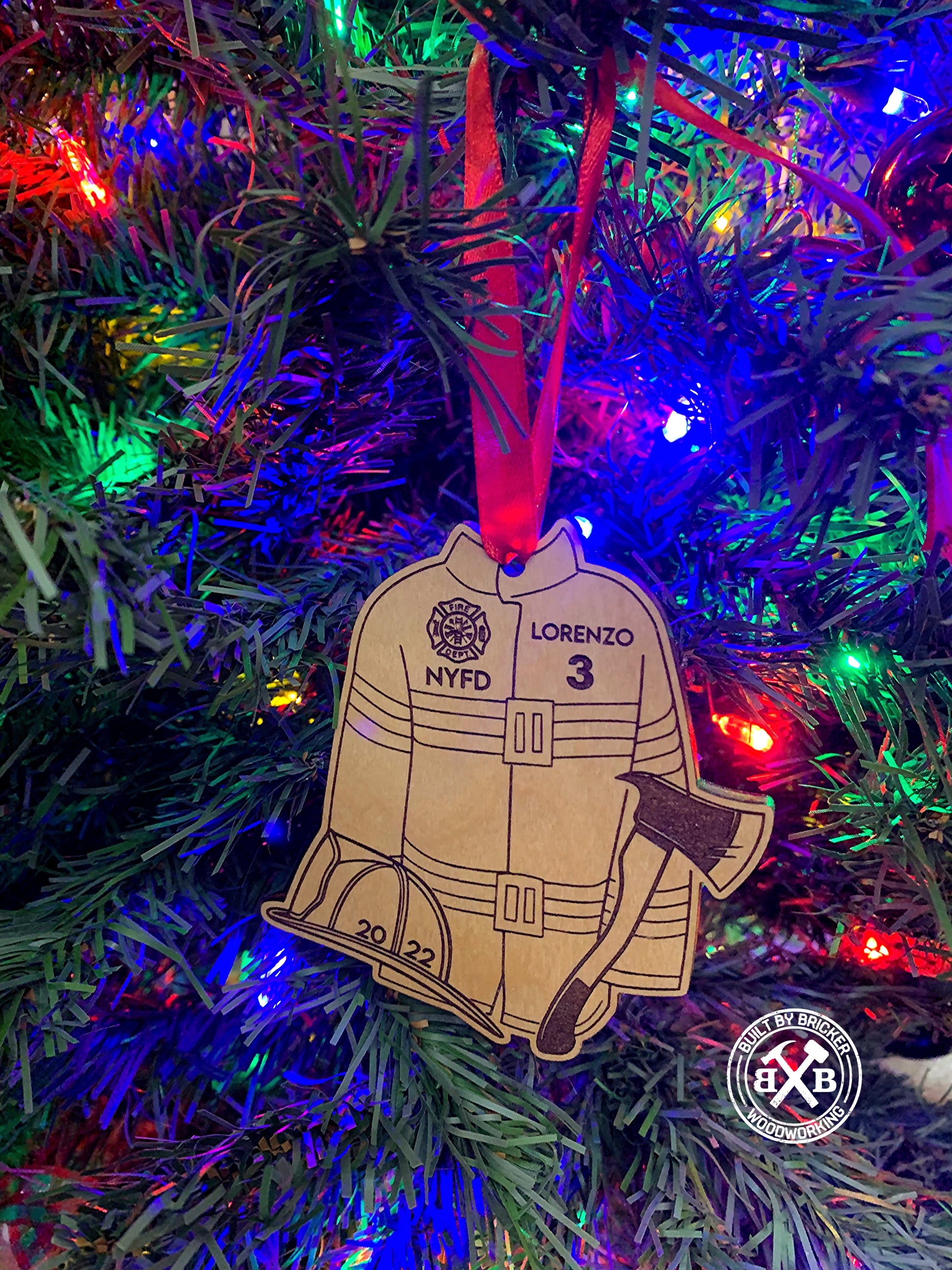 The Firefighter Jacket ornament is approximately 4" tall x 3.5" wide. Its made from 1/8" Maple Plywood.