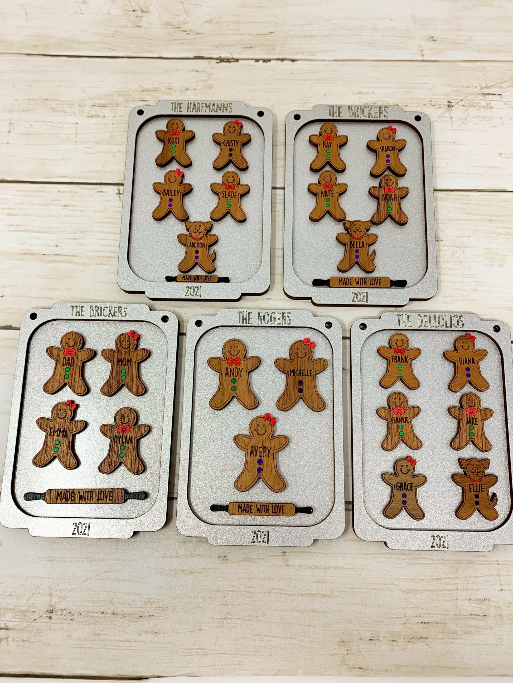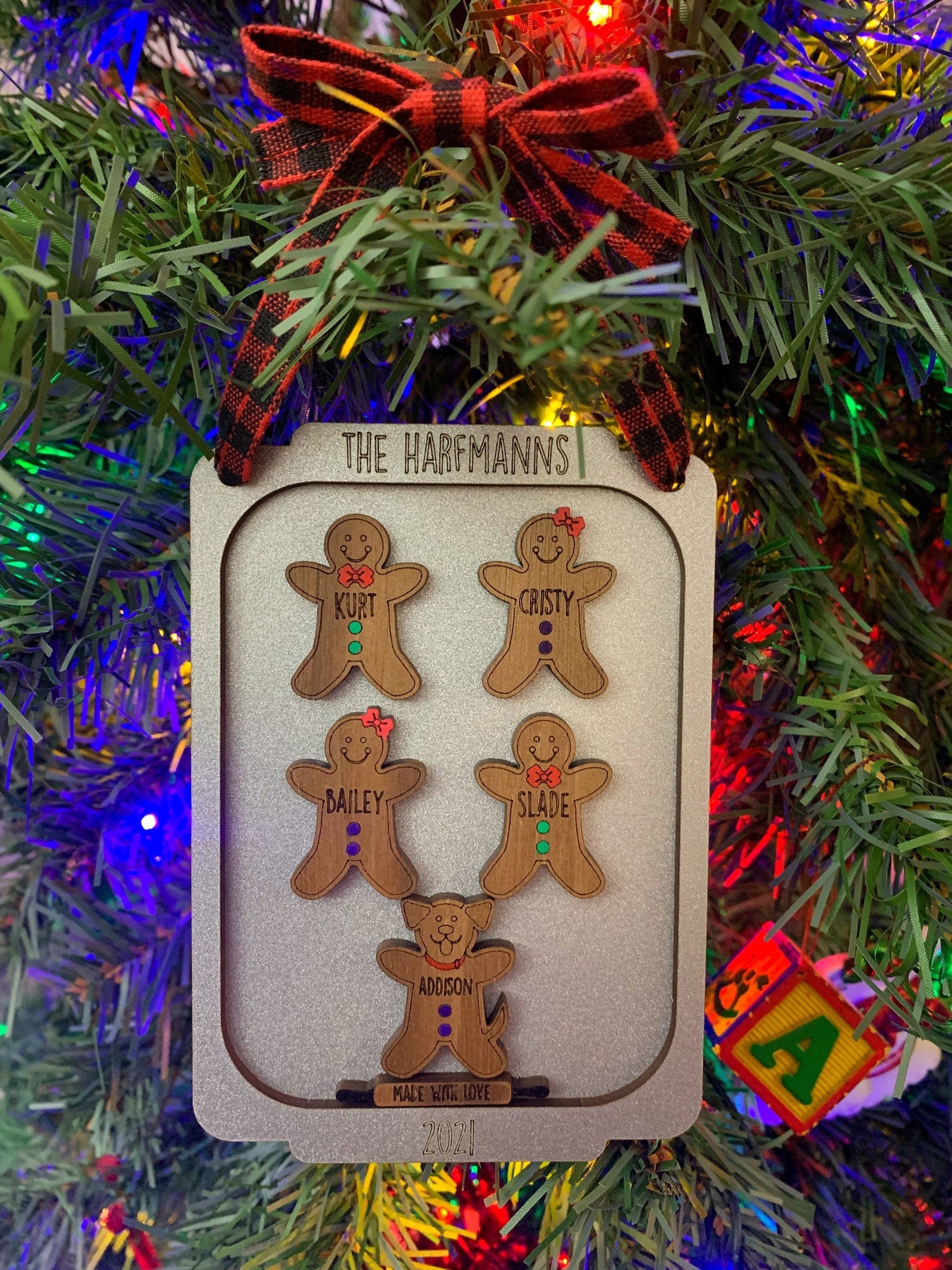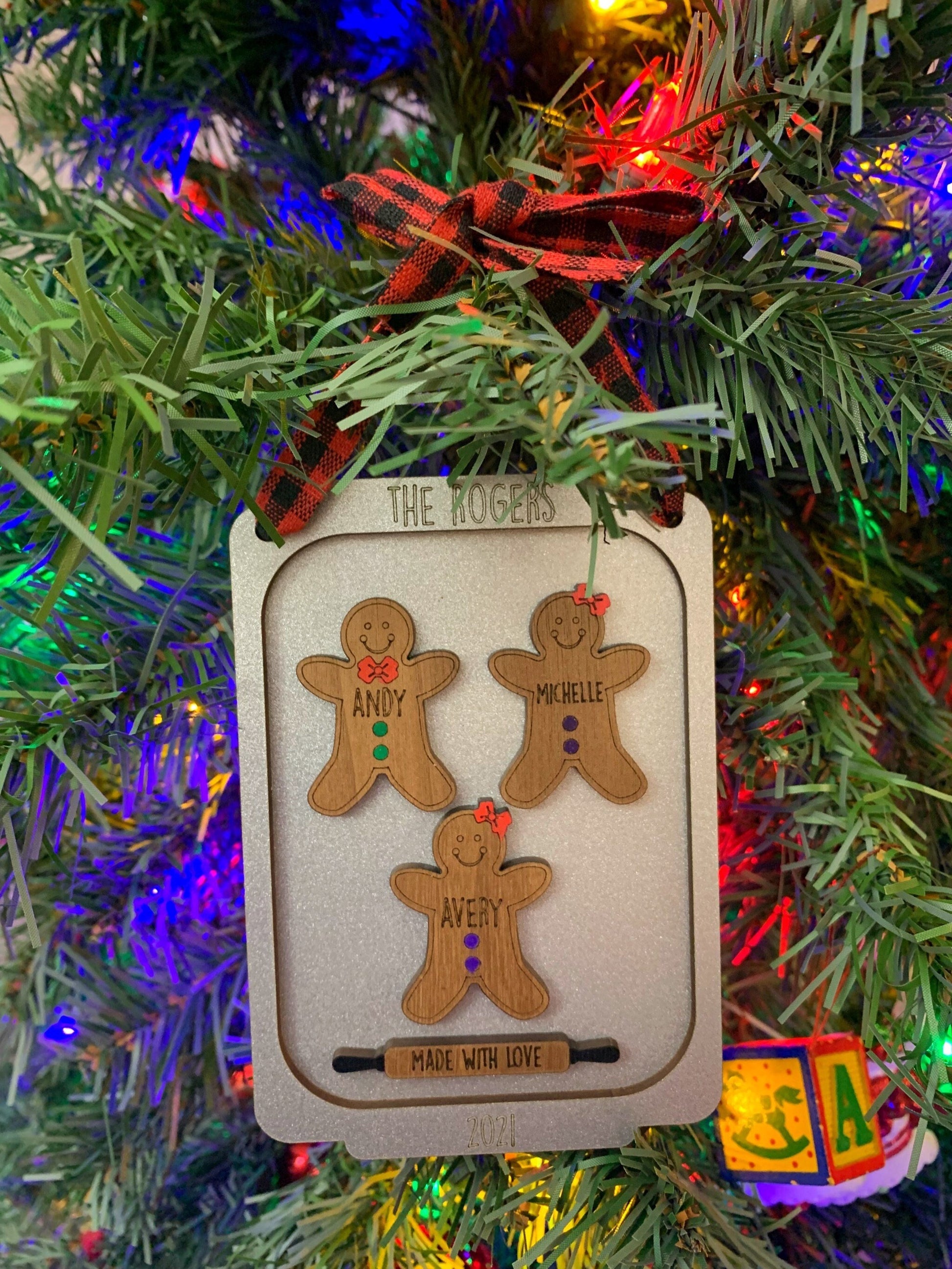 - Each gingerbread is cut out of walnut plywood and laser engraved with the name of your choice. The bow/bowtie and buttons are than hand painted (green buttons and red bow/bowtie unless you otherwise specify in the notes when checking out). The cookie pan measure approximately 5” x 3.5” and is two layers stacked, painted in metallic silver, and displays the family name or phrase of your choosing and the year 2022. Any of this can be customized to your liking. Each ornament includes a rolling pin that reads "Made with Love" and comes with a ribbon to hang from the tree.
