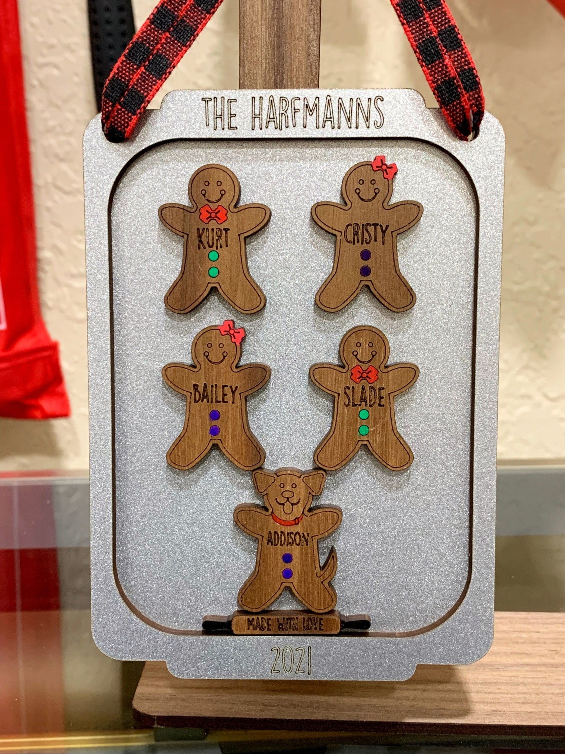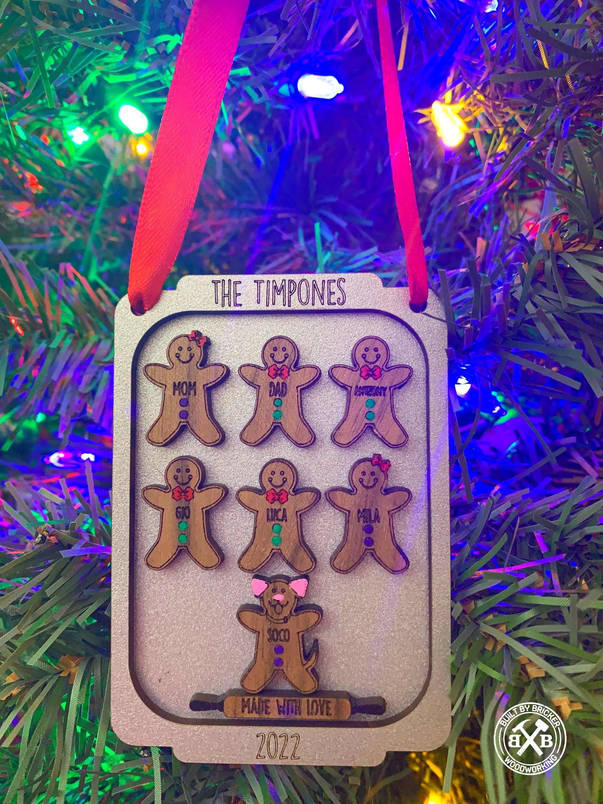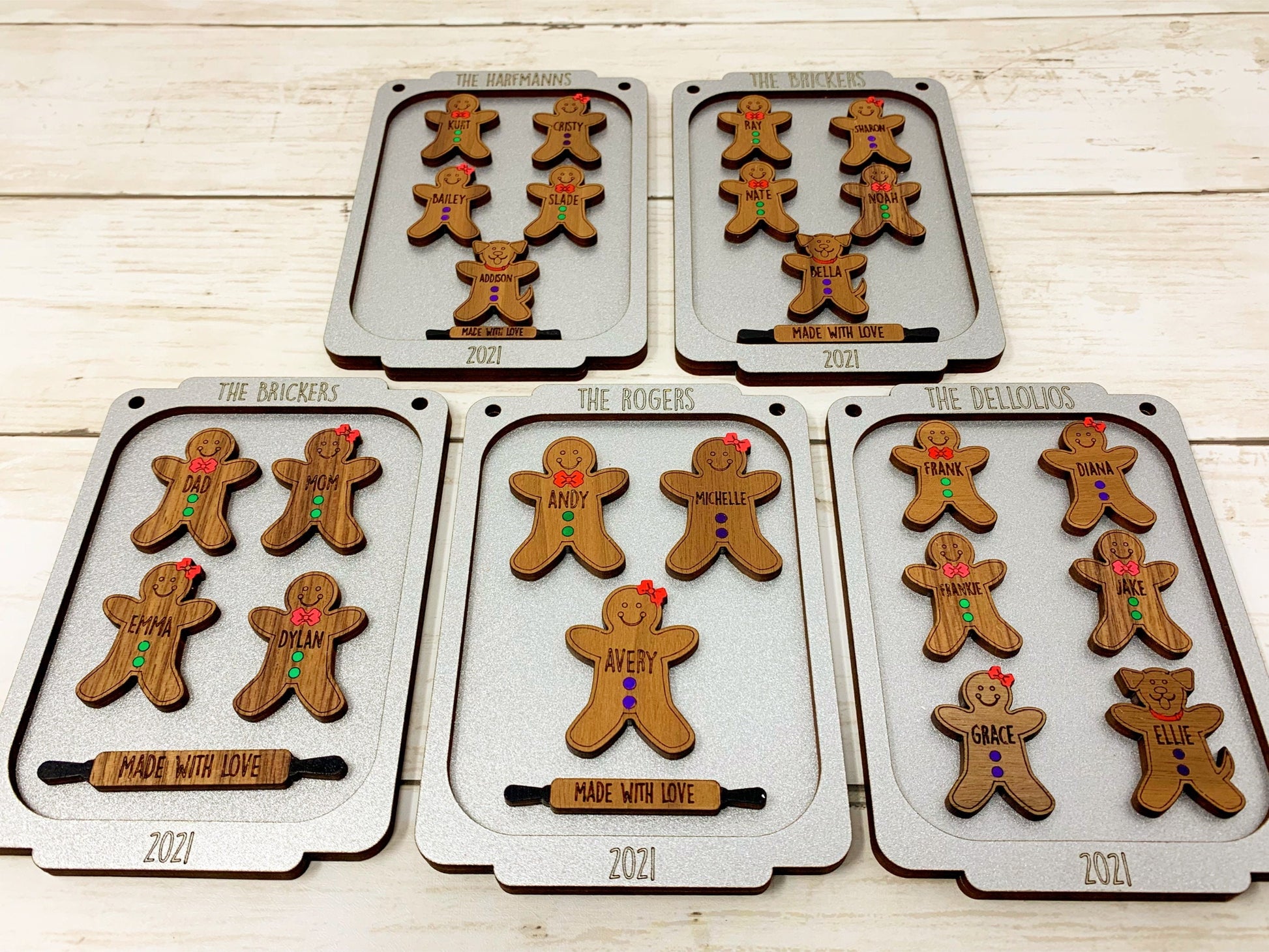 - Each gingerbread is cut out of walnut plywood and laser engraved with the name of your choice. The bow/bowtie and buttons are than hand painted (green buttons and red bow/bowtie unless you otherwise specify in the notes when checking out). The cookie pan measure approximately 5” x 3.5” and is two layers stacked, painted in metallic silver, and displays the family name or phrase of your choosing and the year 2022. Any of this can be customized to your liking. Each ornament includes a rolling pin that reads "Made with Love" and comes with a ribbon to hang from the tree.