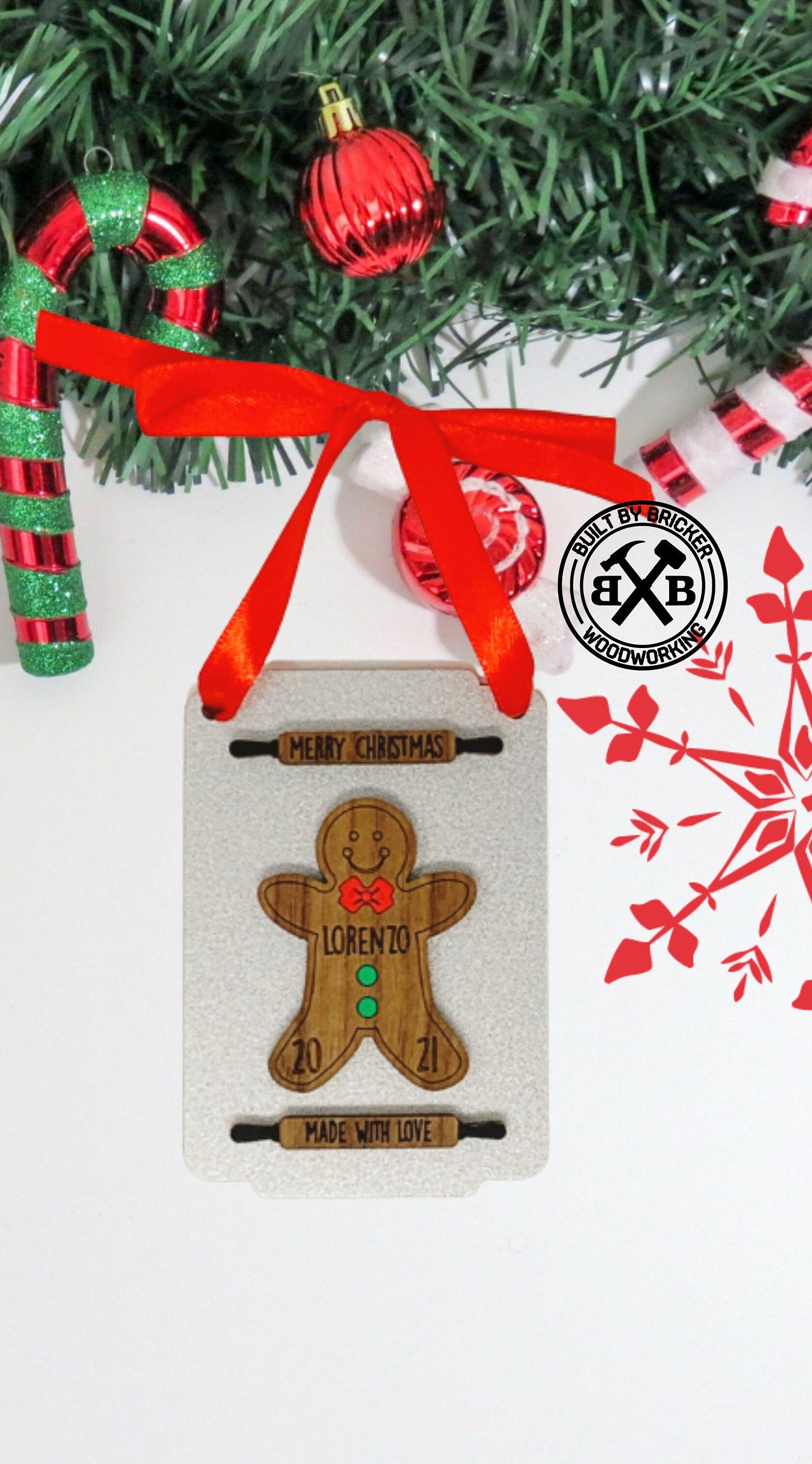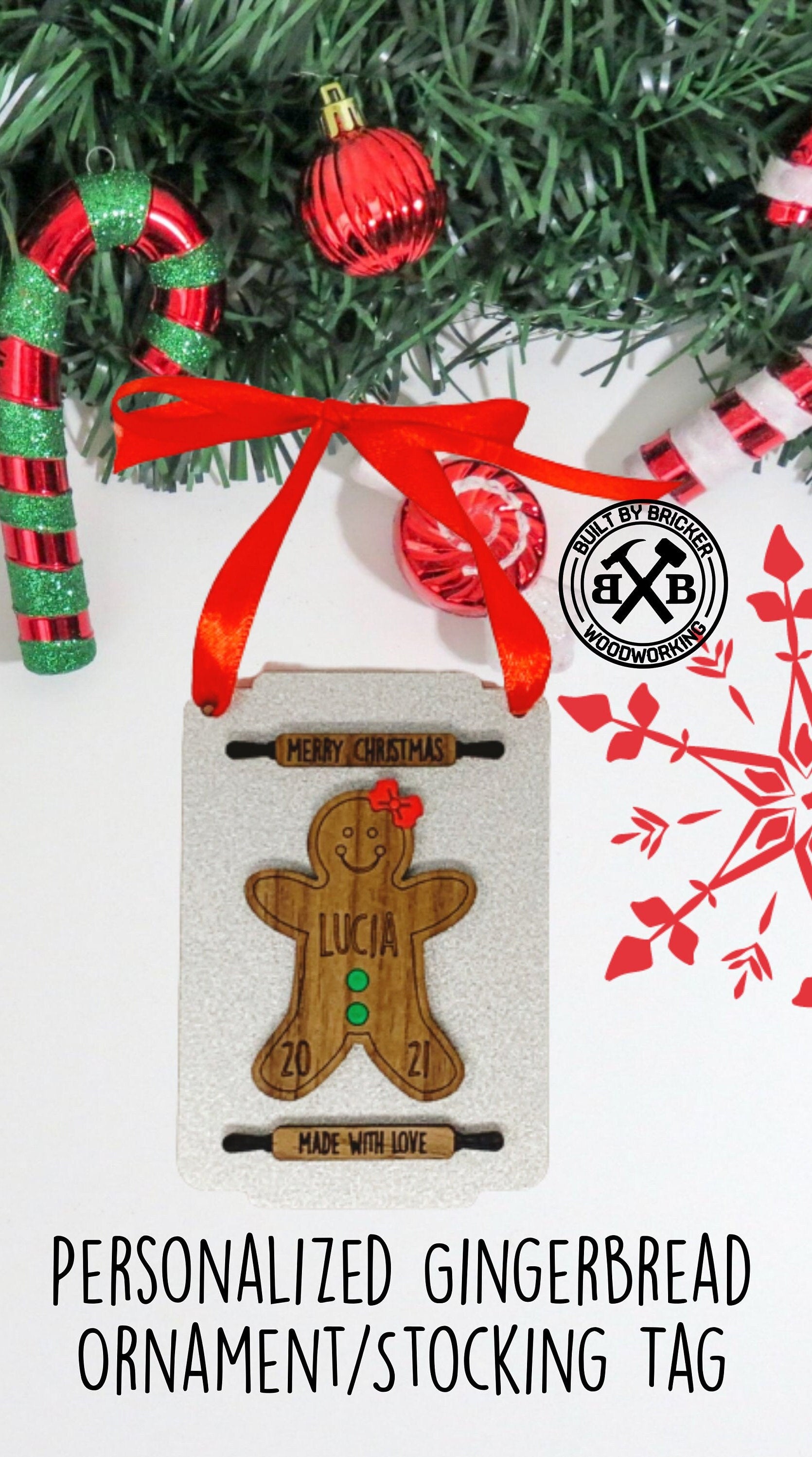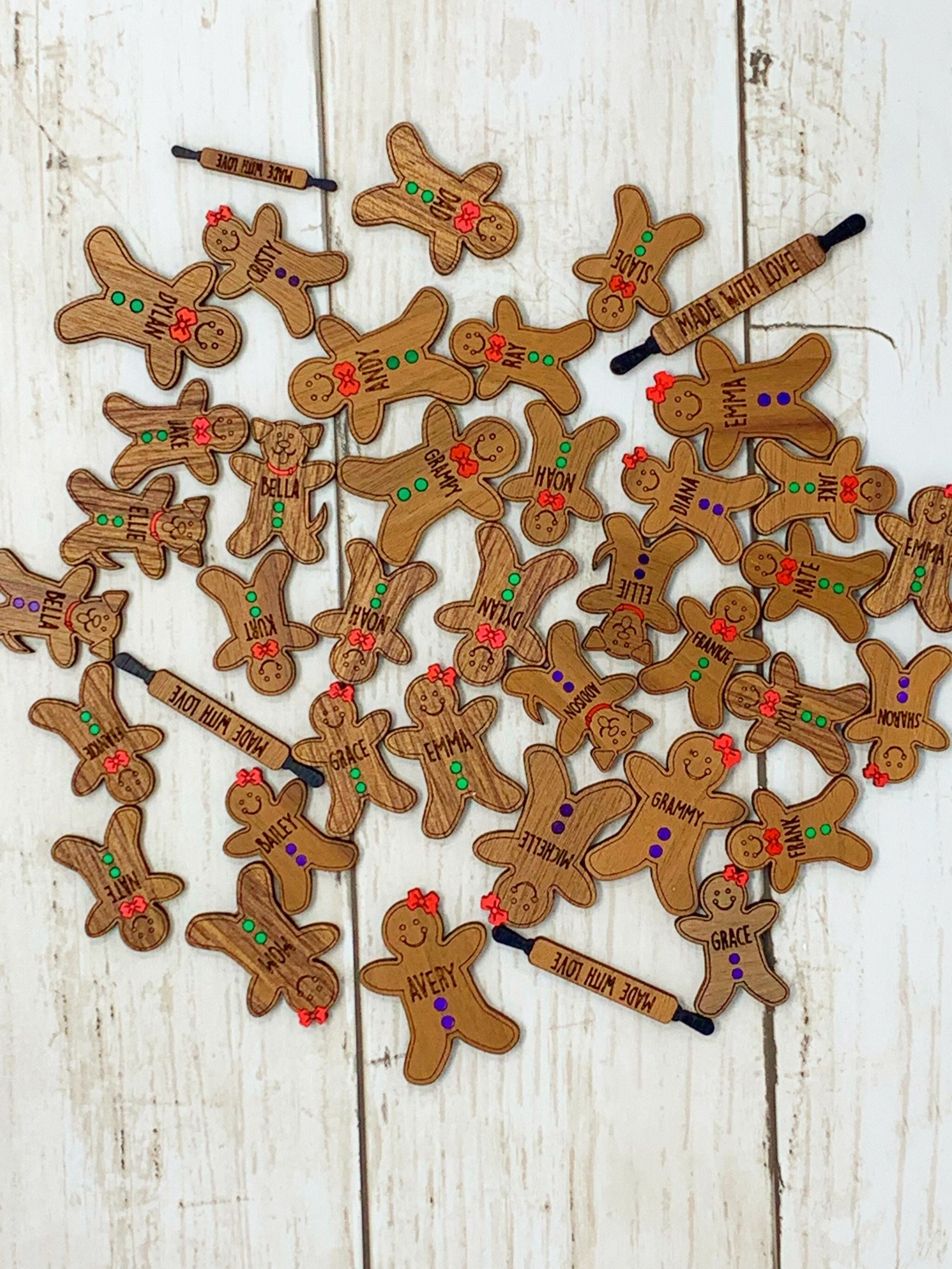 - Each gingerbread is cut out of 1/4” walnut plywood and laser engraved with the name of your choice. The bow/bowtie and buttons are than hand painted (green buttons and red bow/bowtie unless you otherwise specify in the notes when checking out). The silver metallic cookie pan is a single layer of 1/8" MDF measuring approximately 4" tall by 2.75" wide. Each one will come with a ribbon to hang from a tree or stocking.