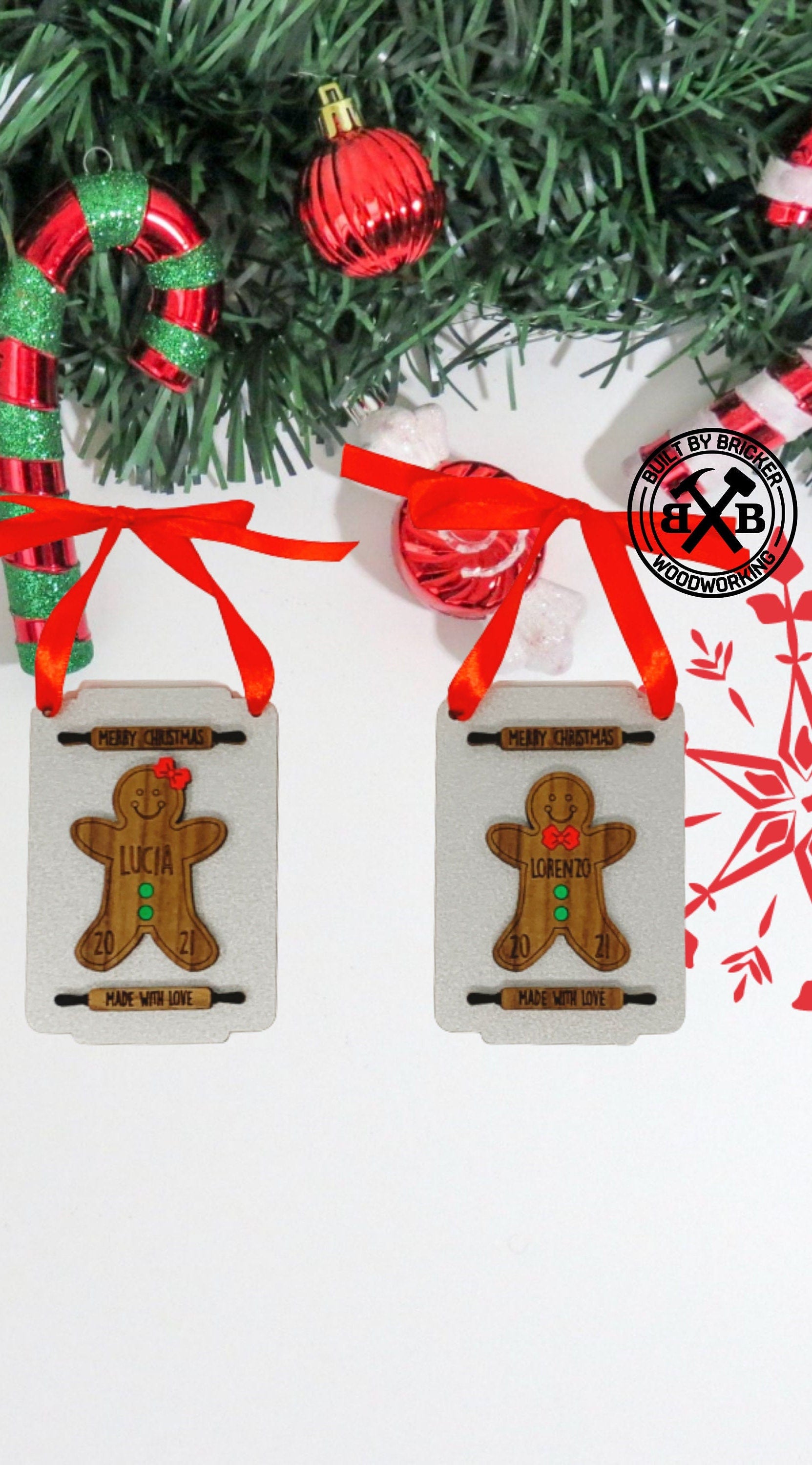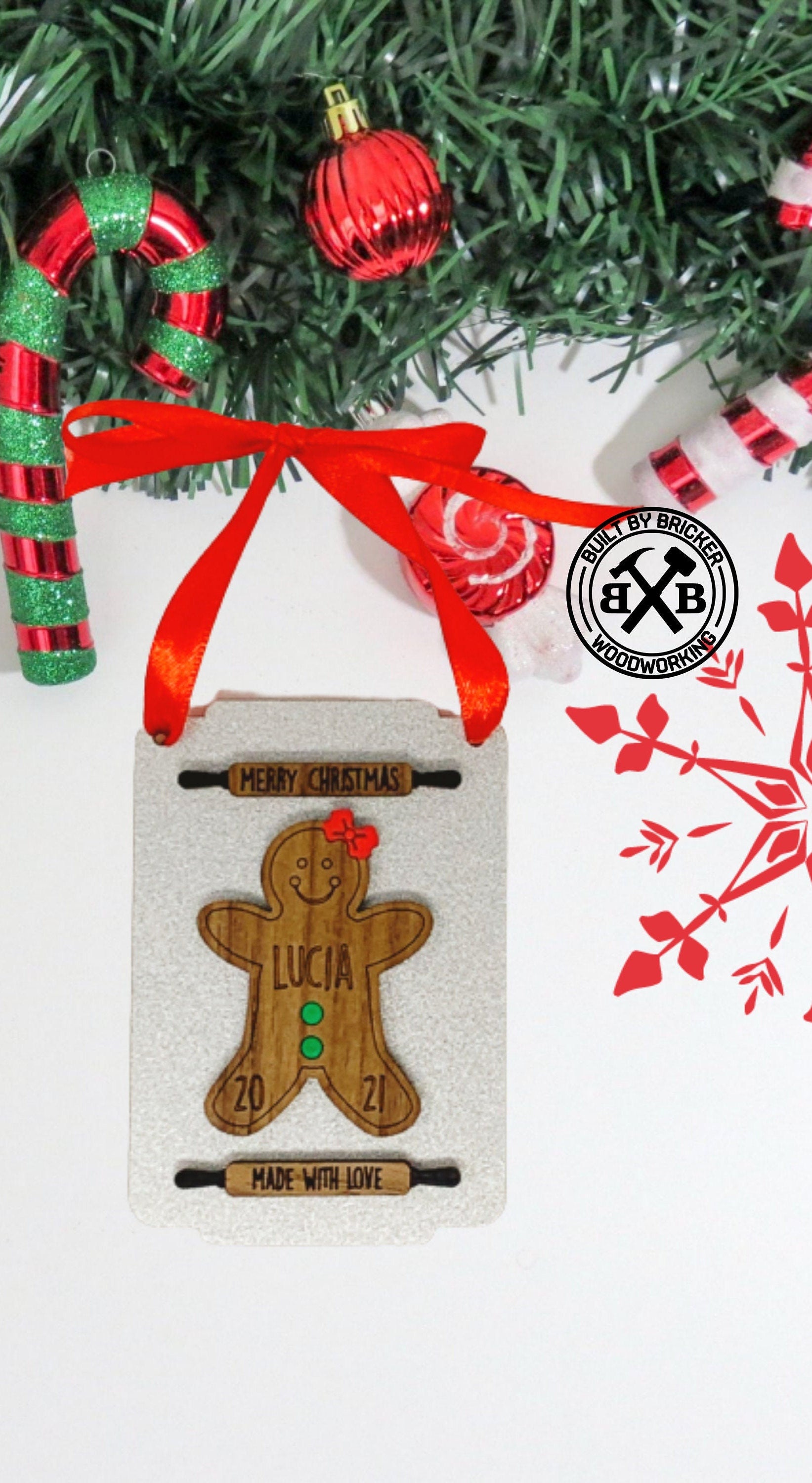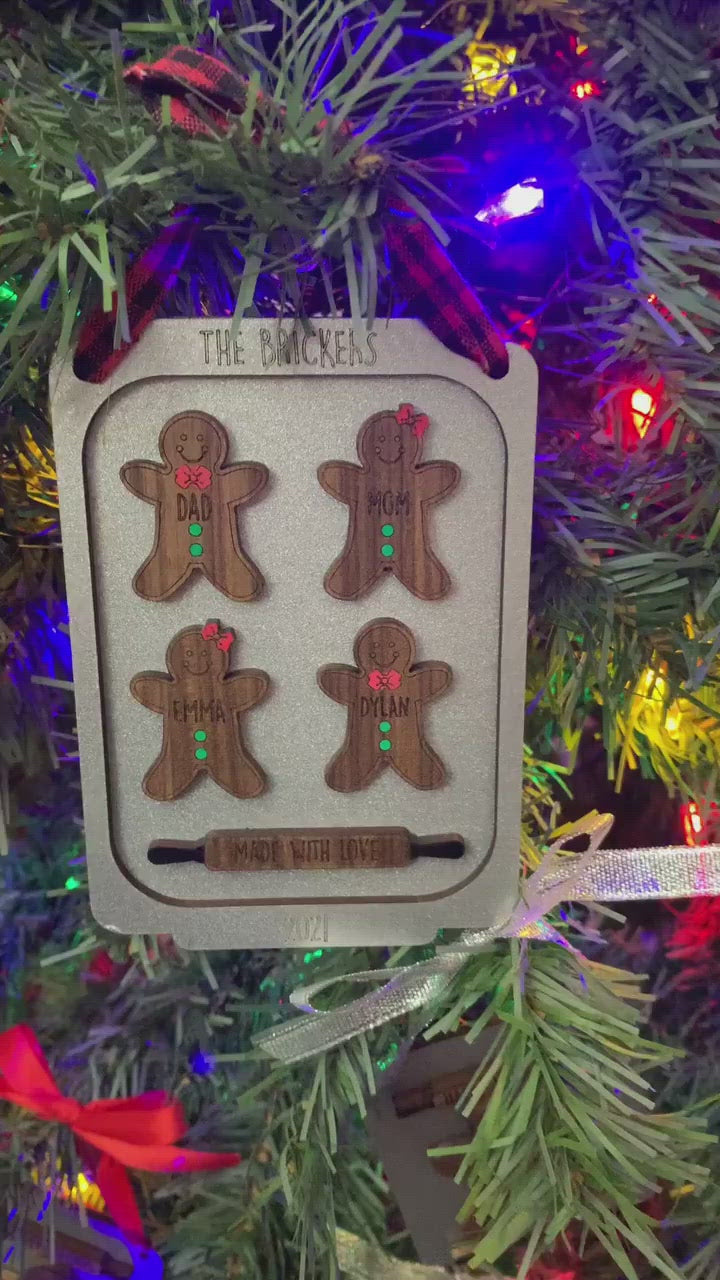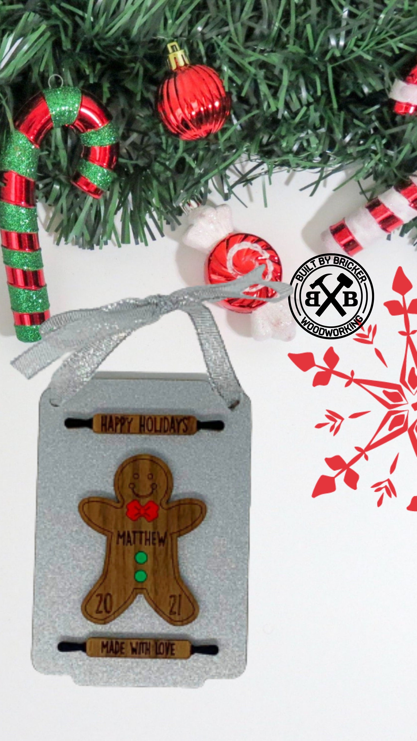 - Each gingerbread is cut out of 1/4” walnut plywood and laser engraved with the name of your choice. The bow/bowtie and buttons are than hand painted (green buttons and red bow/bowtie unless you otherwise specify in the notes when checking out). The silver metallic cookie pan is a single layer of 1/8" MDF measuring approximately 4" tall by 2.75" wide. Each one will come with a ribbon to hang from a tree or stocking.