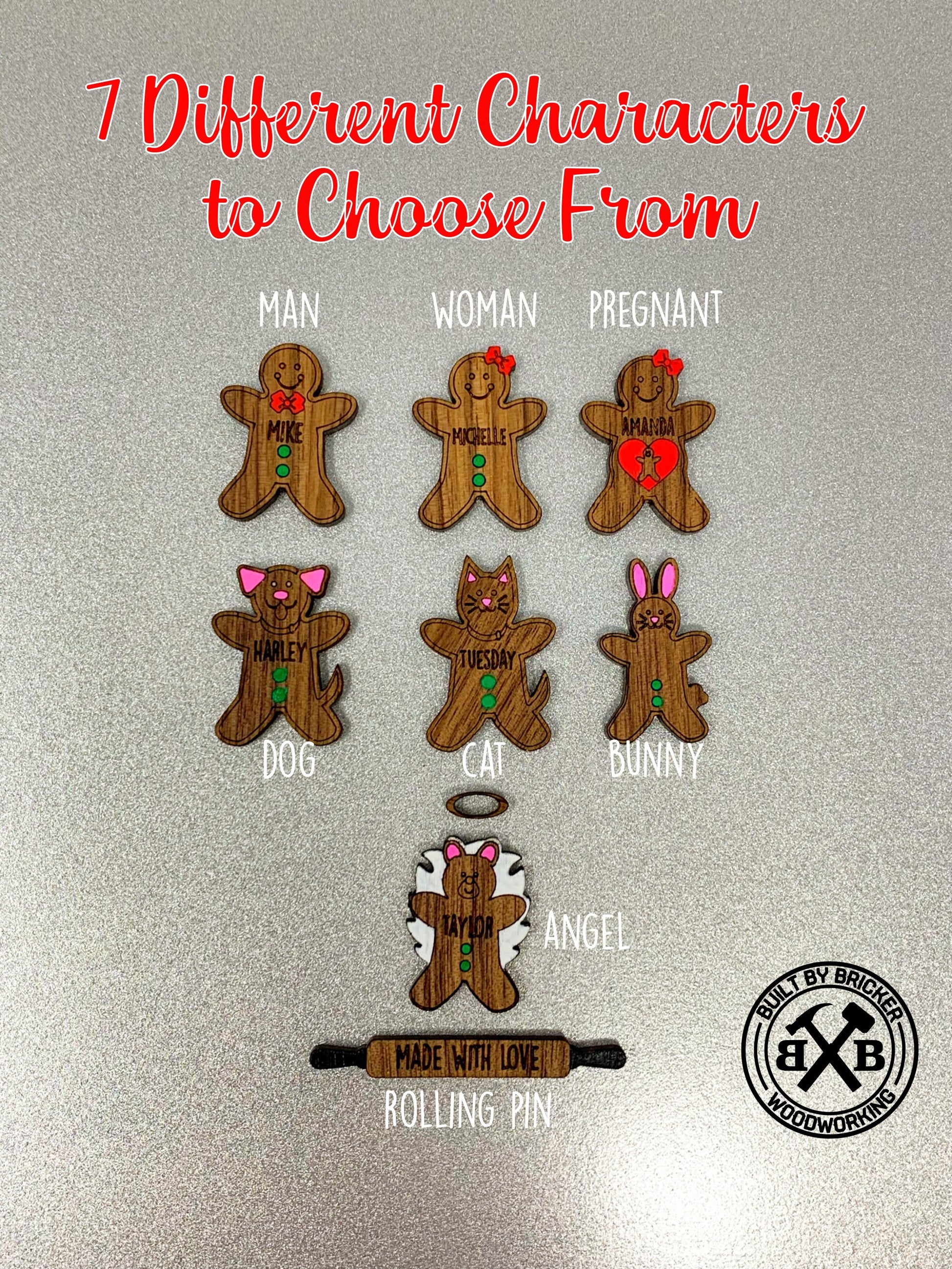 -The available gingerbread characters are as follows: boy, girl, pregnant woman, dog, cat, bunny, and a halo'd angel character (see picture) to represent those no longer with us.