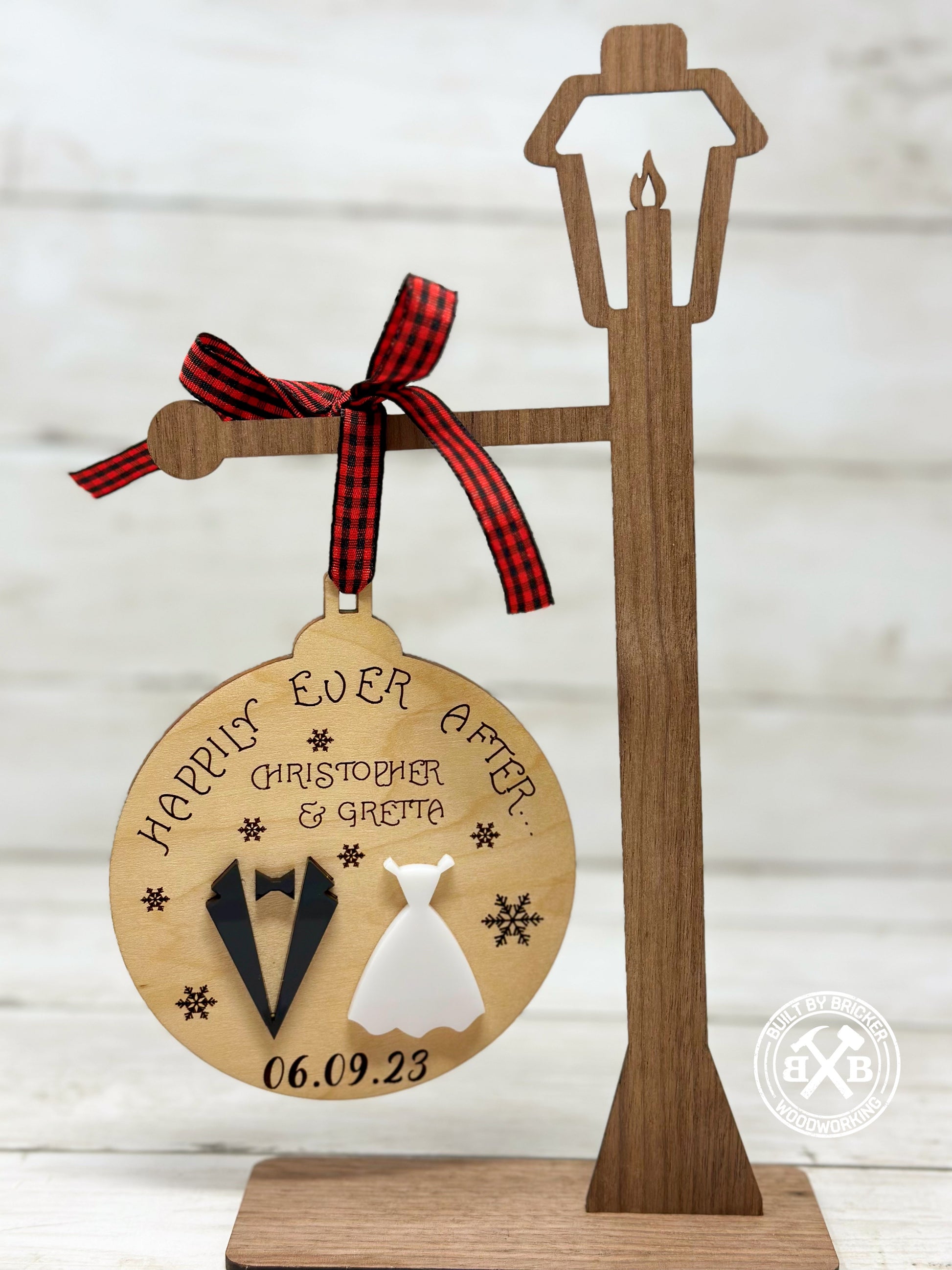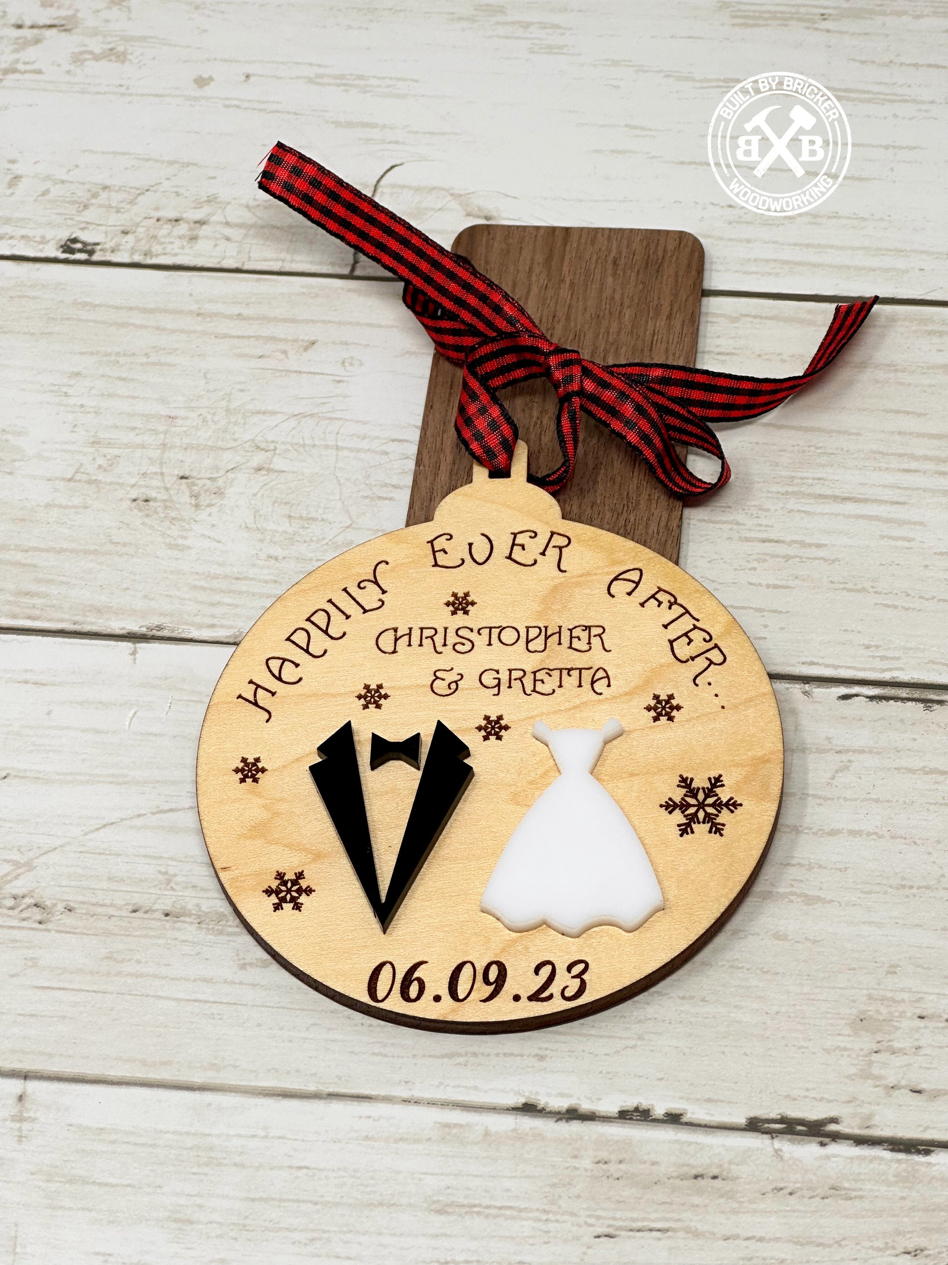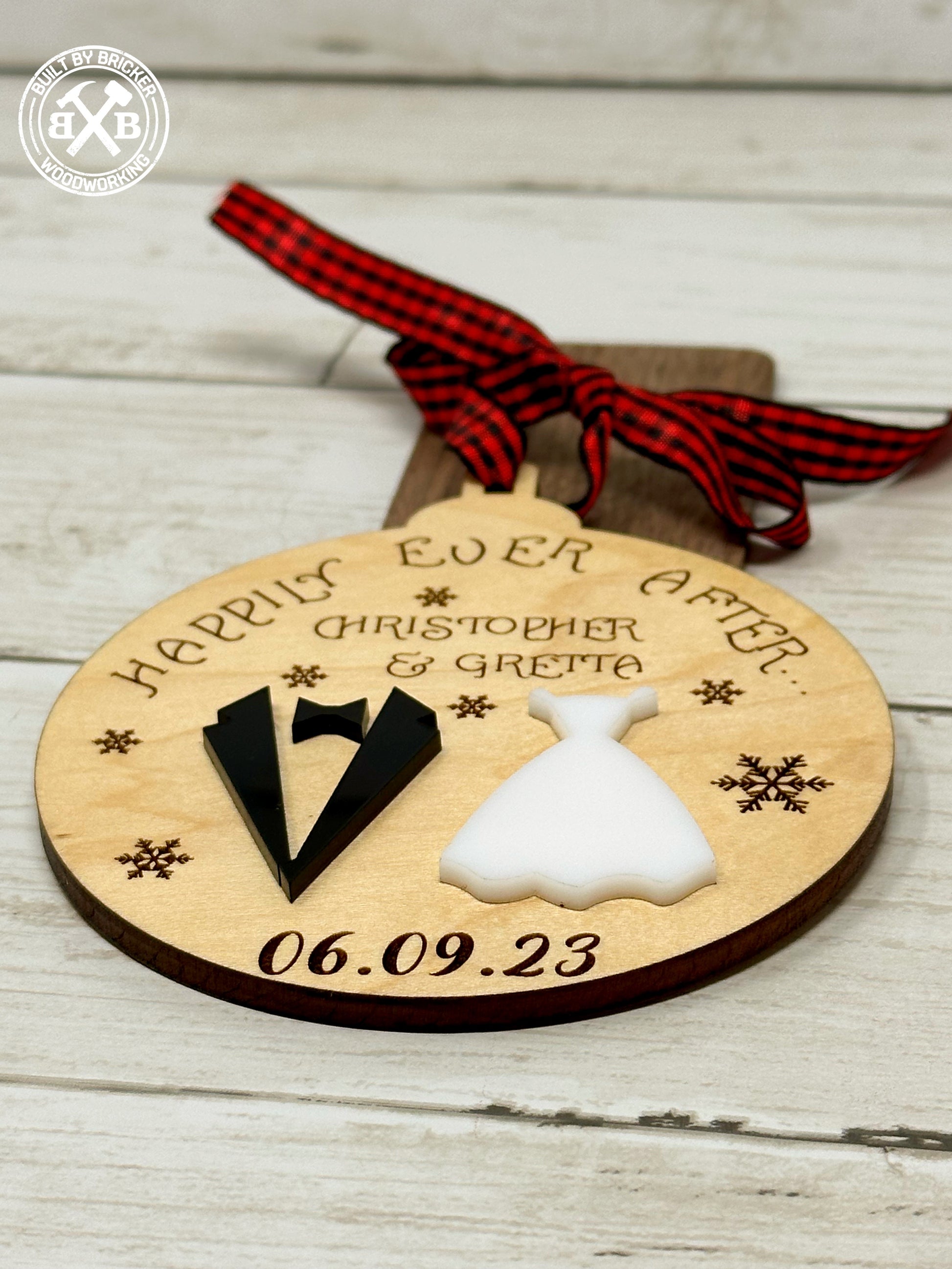 - The maple wood backer is engraved with the phrase "HAPPILY EVER AFTER", the names of the newlyweds (Could also did family last name instead ie "The Brickers"), snowflakes, and the wedding date. The brides dress is made from 1/8" white acrylic and the tuxedo is from 1/8" black acrylic. Included is a festive ribbon for hanging the ornament on the tree.