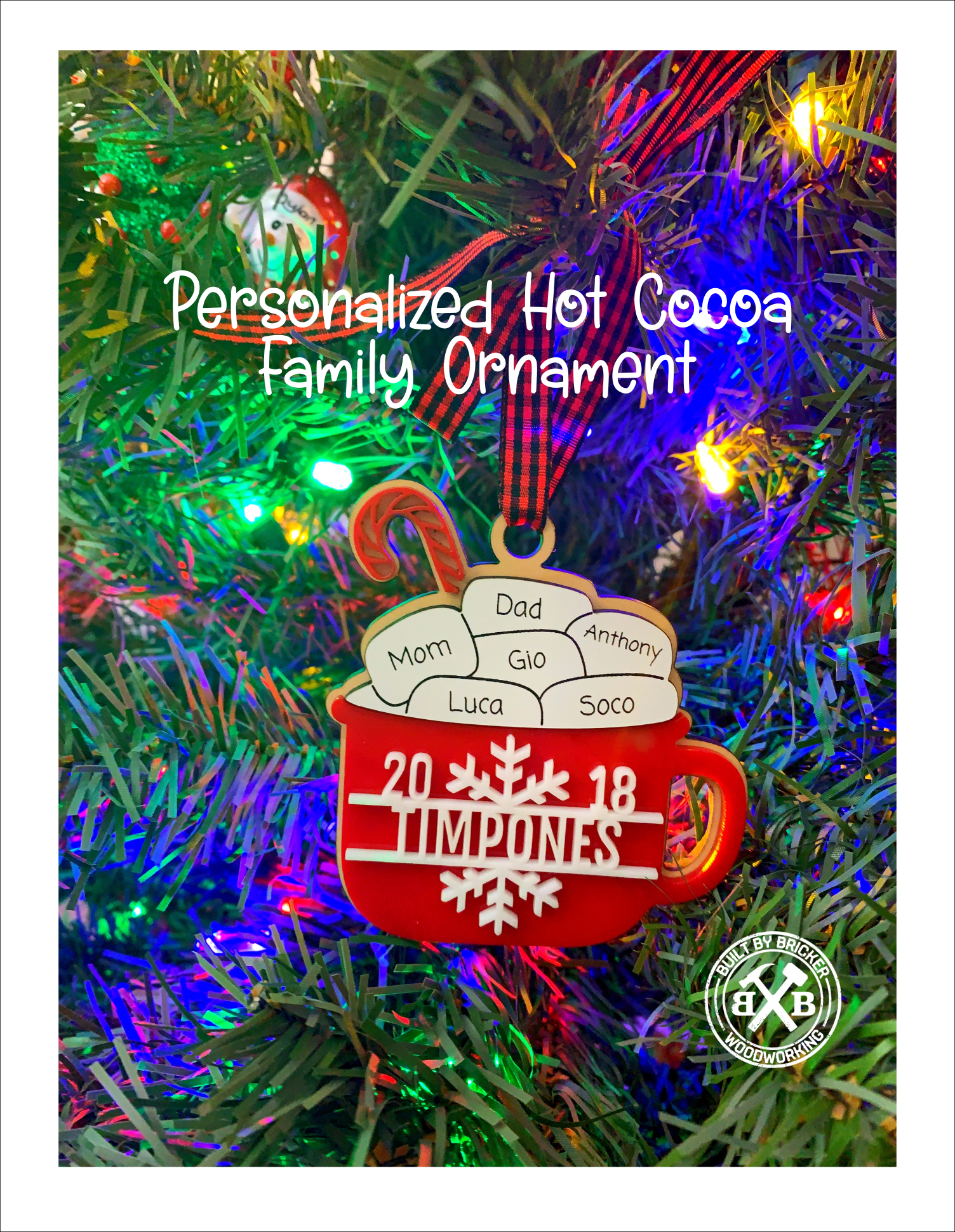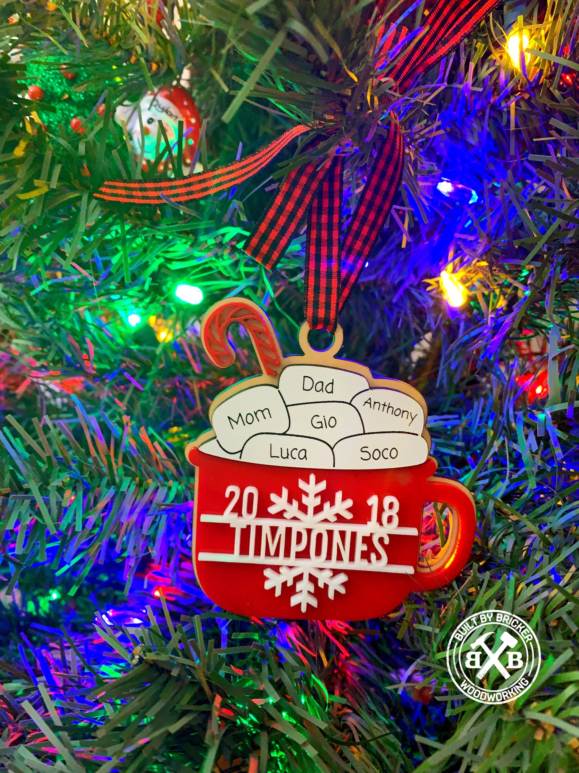 - The maple wood backer is topped with a red acrylic mug. Above the mug are the engraved marshmallows with your family members names. This mug can accommodate up to 6 names. The snowflake sitting on top of the mug is made from white acrylic and can display the year and family name. A red acrylic candy cane is the perfect topper.