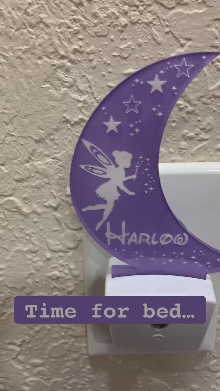 This design is in the shape of the moon featuring a fairy with scattered stars in various shapes and sizes. This night light can be personalized with any name and color so that it still stands out even during the day!