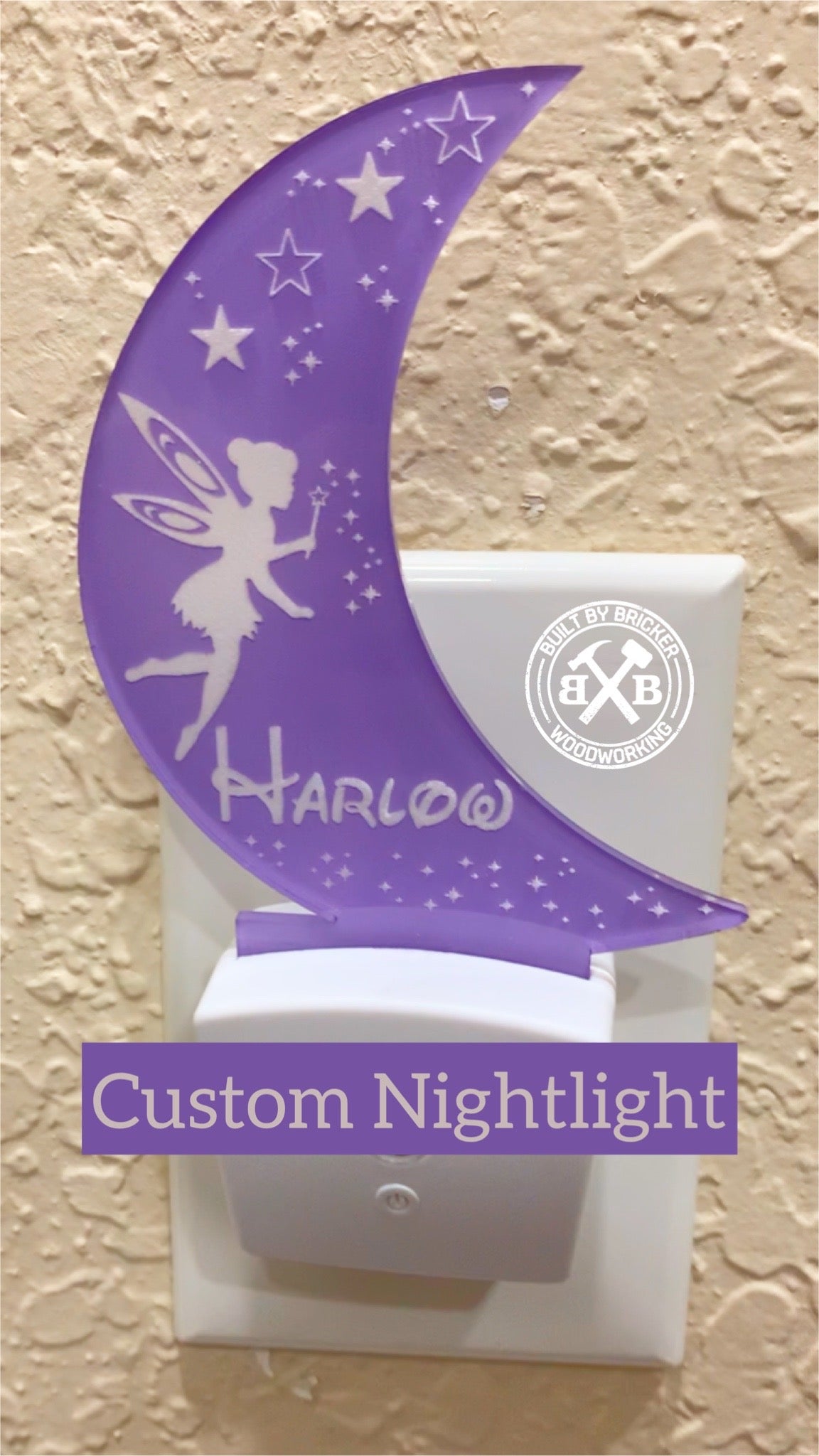 - You can choose between what color wall plug you would like (white or black) and what color you would like the acrylic to be. The backside of the night light can be painted a solid color (purple in the example photo), and then the engrave is done on the back leaving the front smooth. This gives the night light beauty in the day and night.