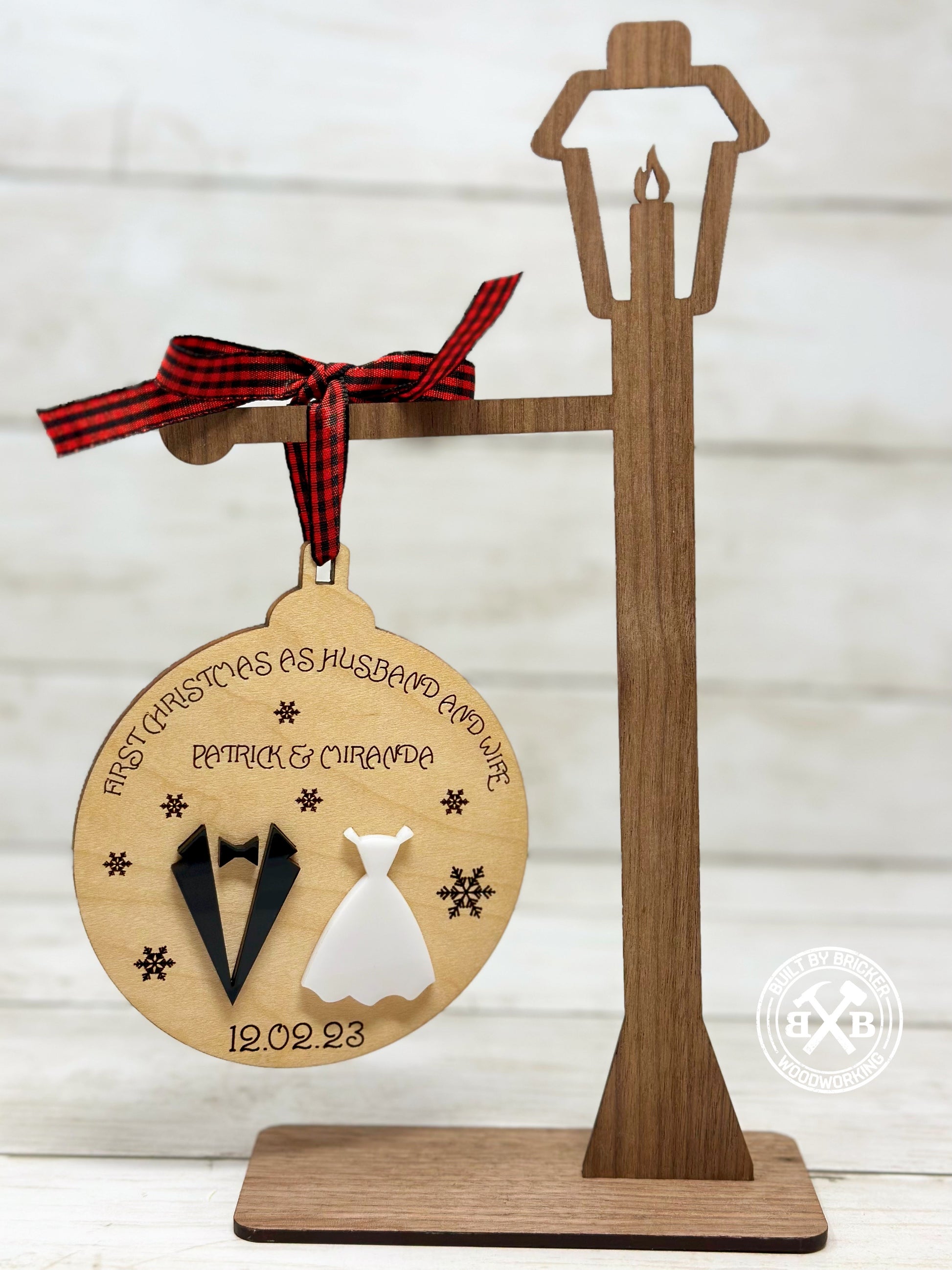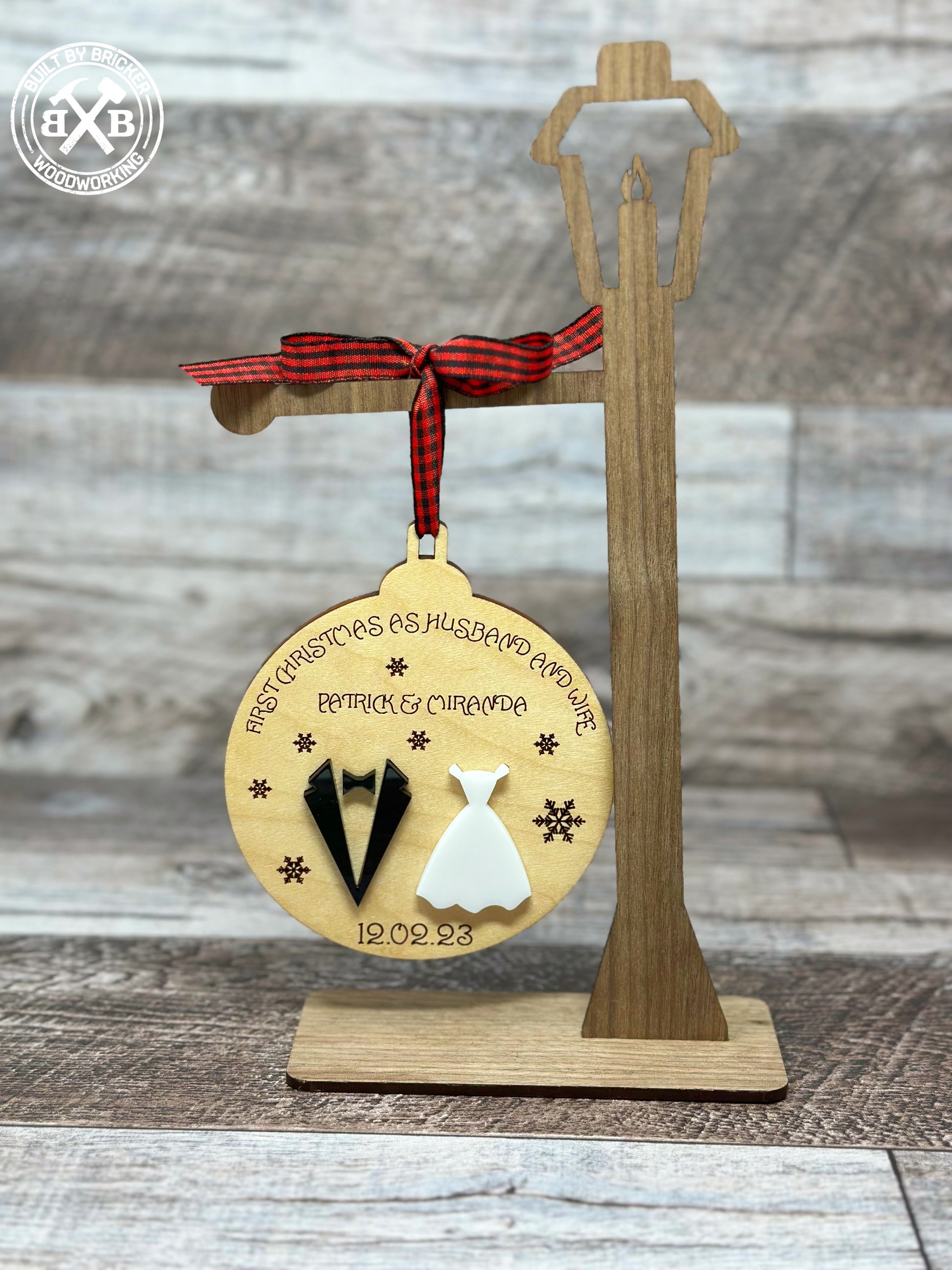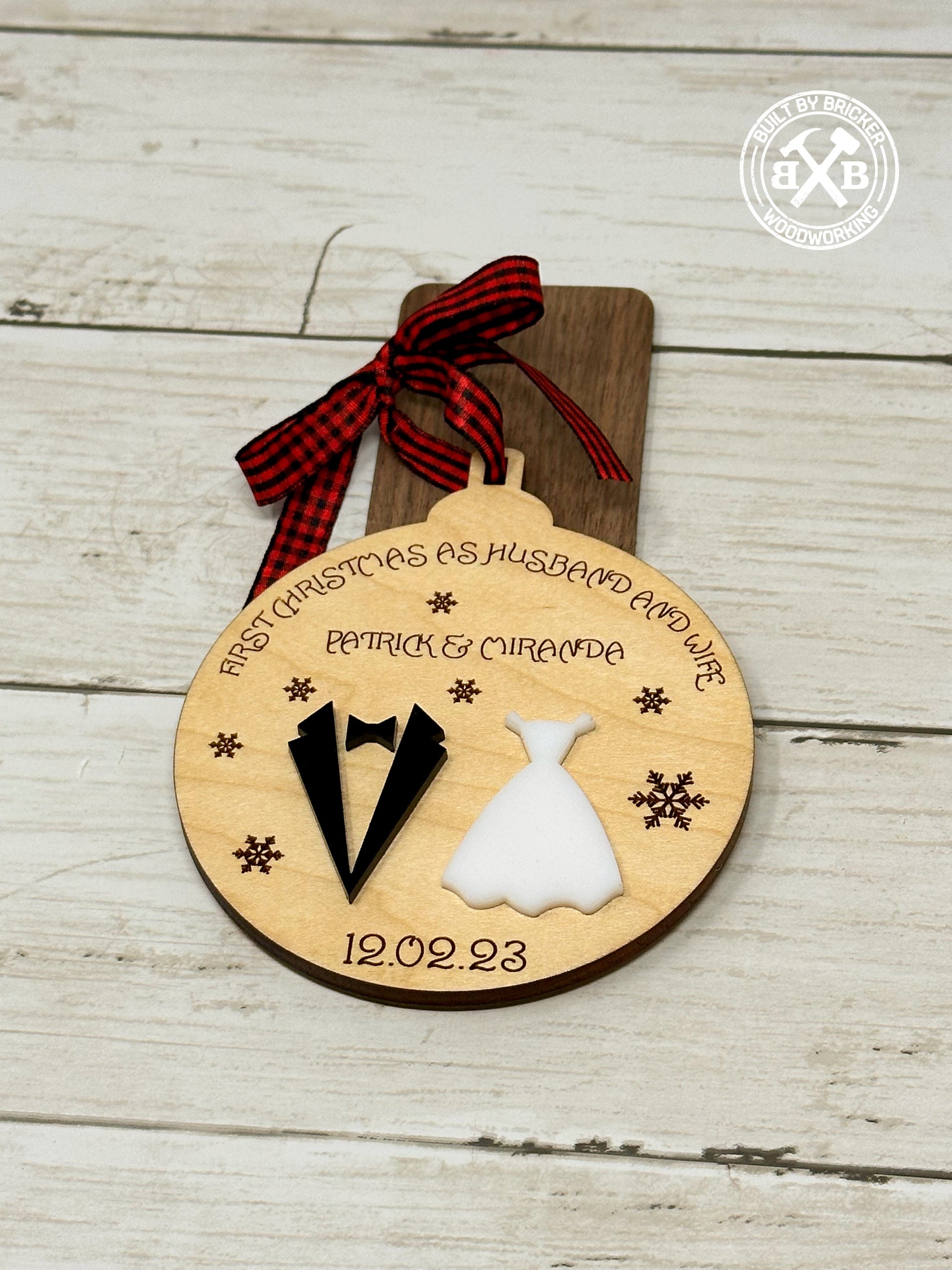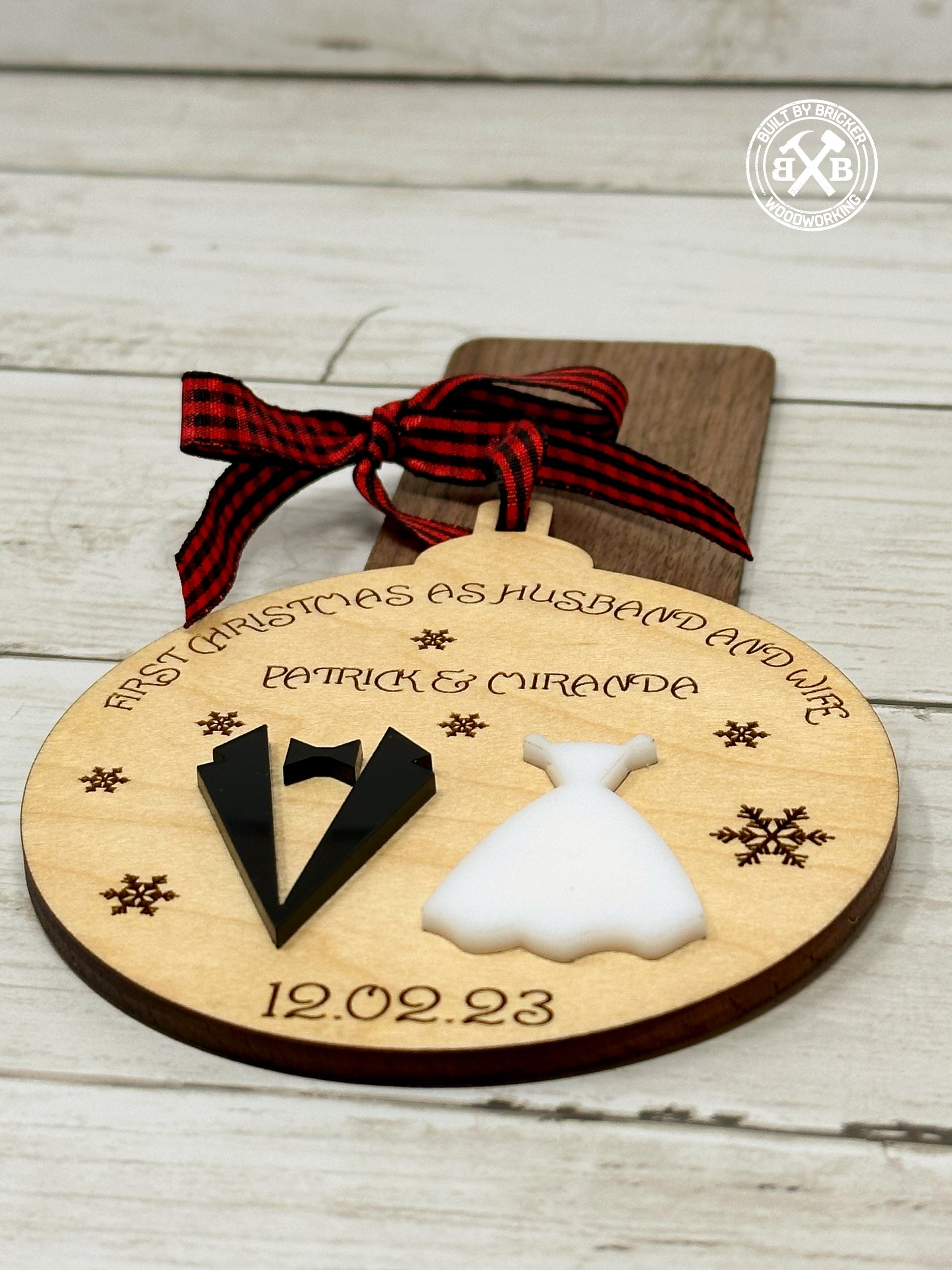 - The maple wood backer is engraved with the phrase "FIRST CHRISTMAS AS HUSBAND AND WIFE", the names of the newlyweds (Could also did family last name instead ie "The Brickers"), snowflakes, and the wedding date. The brides dress is made from 1/8" white acrylic and the tuxedo is from 1/8" black acrylic. Included is a festive ribbon for hanging the ornament on the tree.