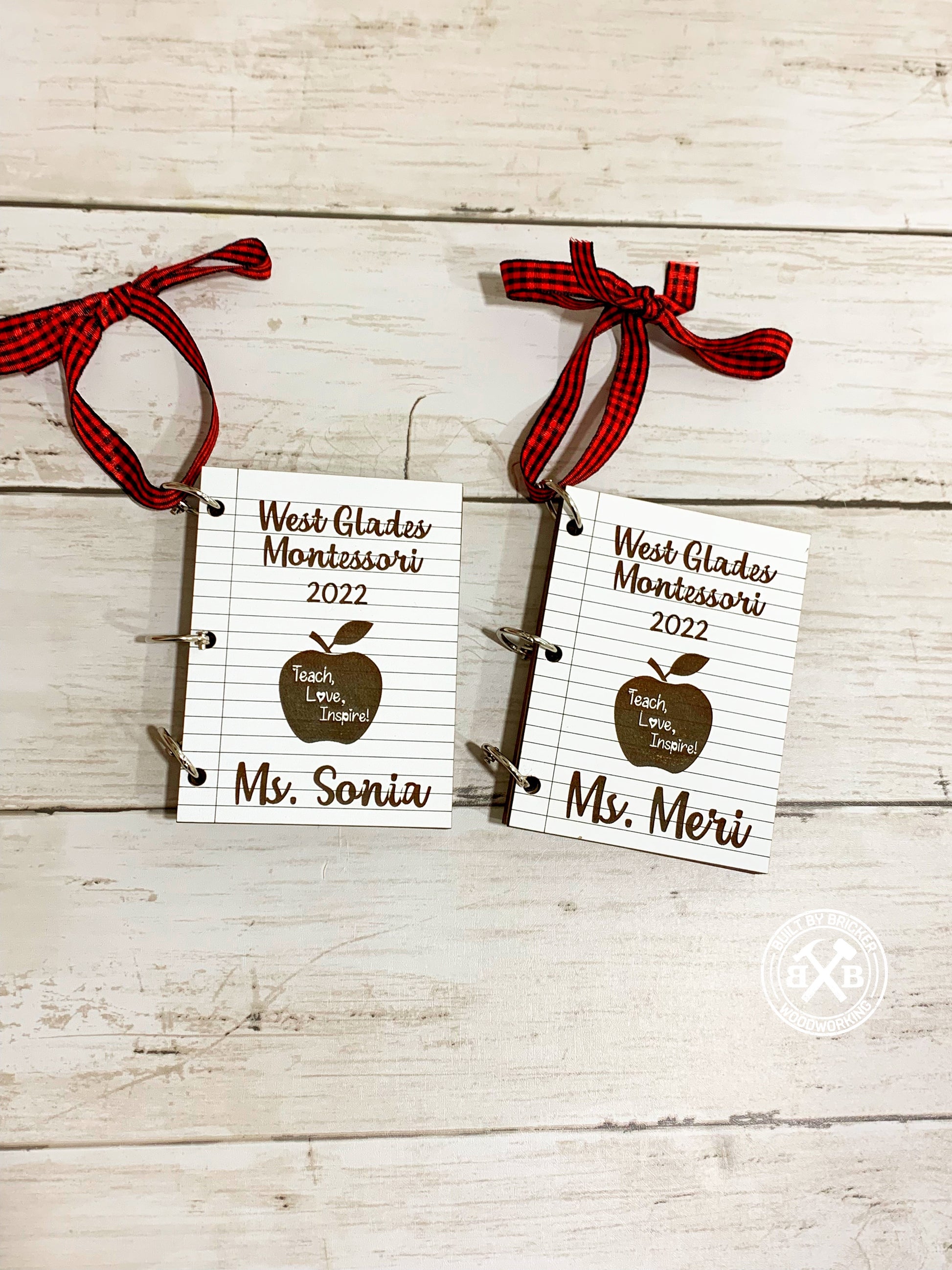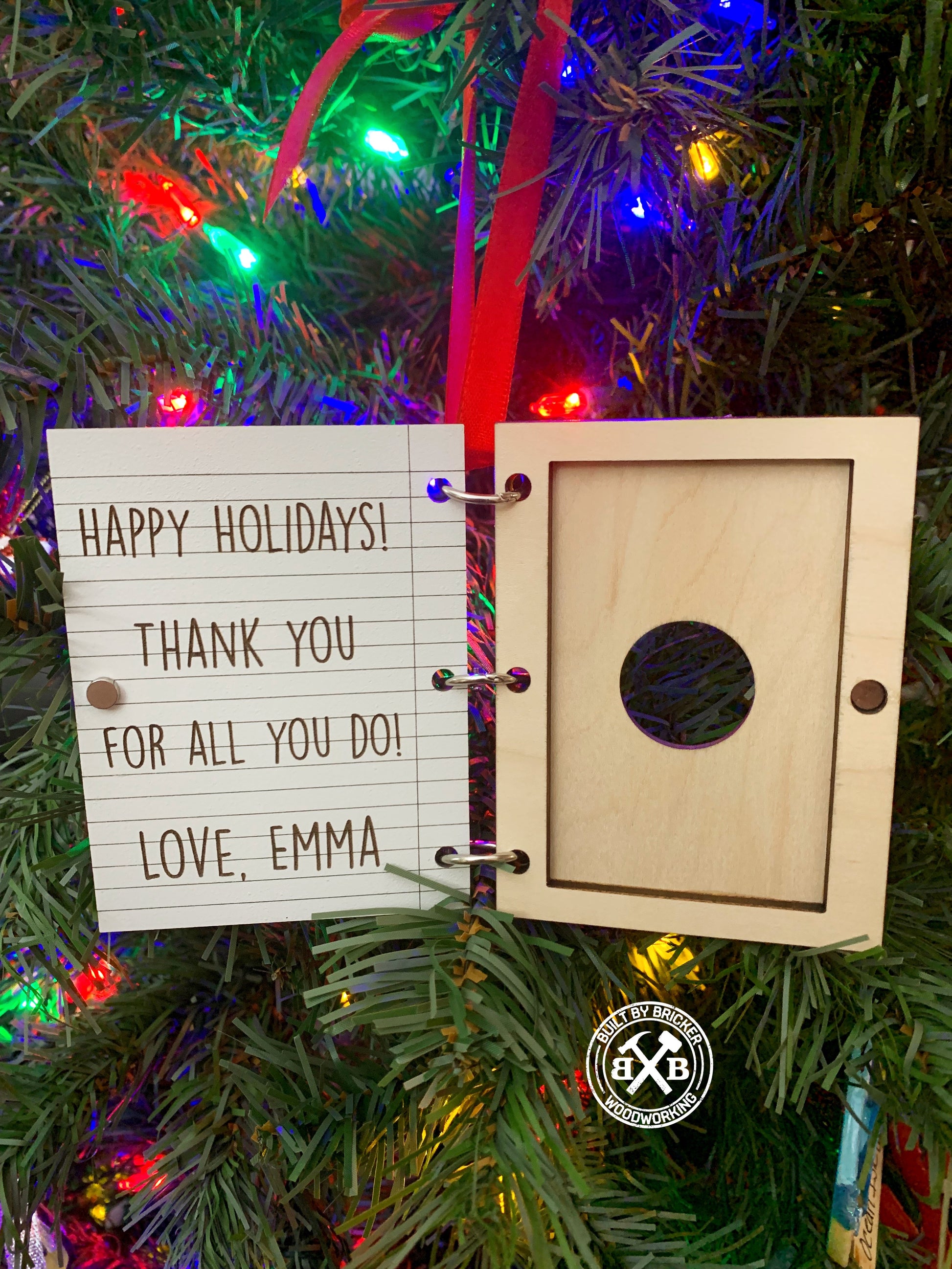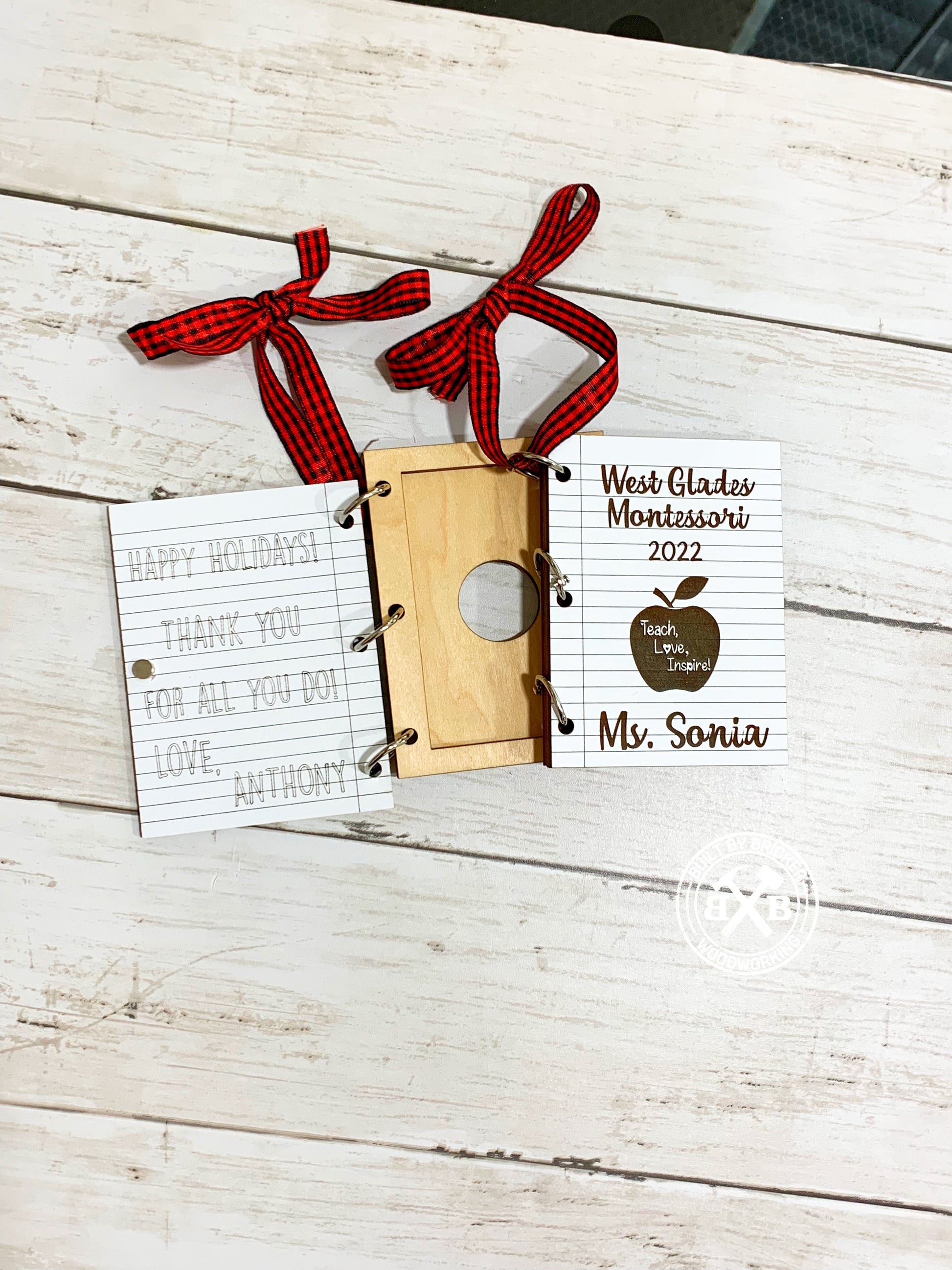 - These are made from whiteboard and maple plywood. There are 3 rings attached to hold the notebook together as well as a magnet to keep it all closed. The very back piece has a hole to poke your finger through to easily knock out the gift card. A piece of ribbon will be attached so it can be used as an ornament. The approximate size is 4" tall x 3" wide. The gift card slot will hold most generic sized gift cards.