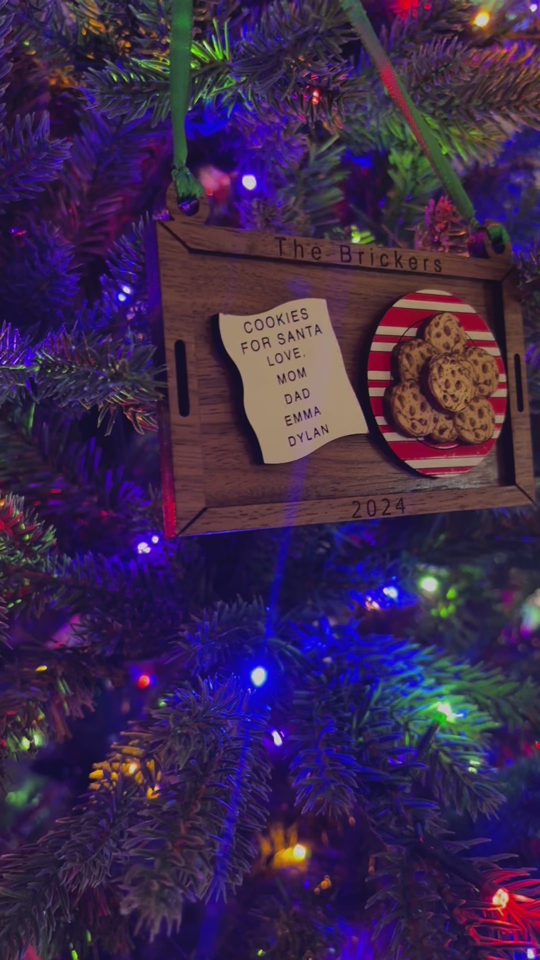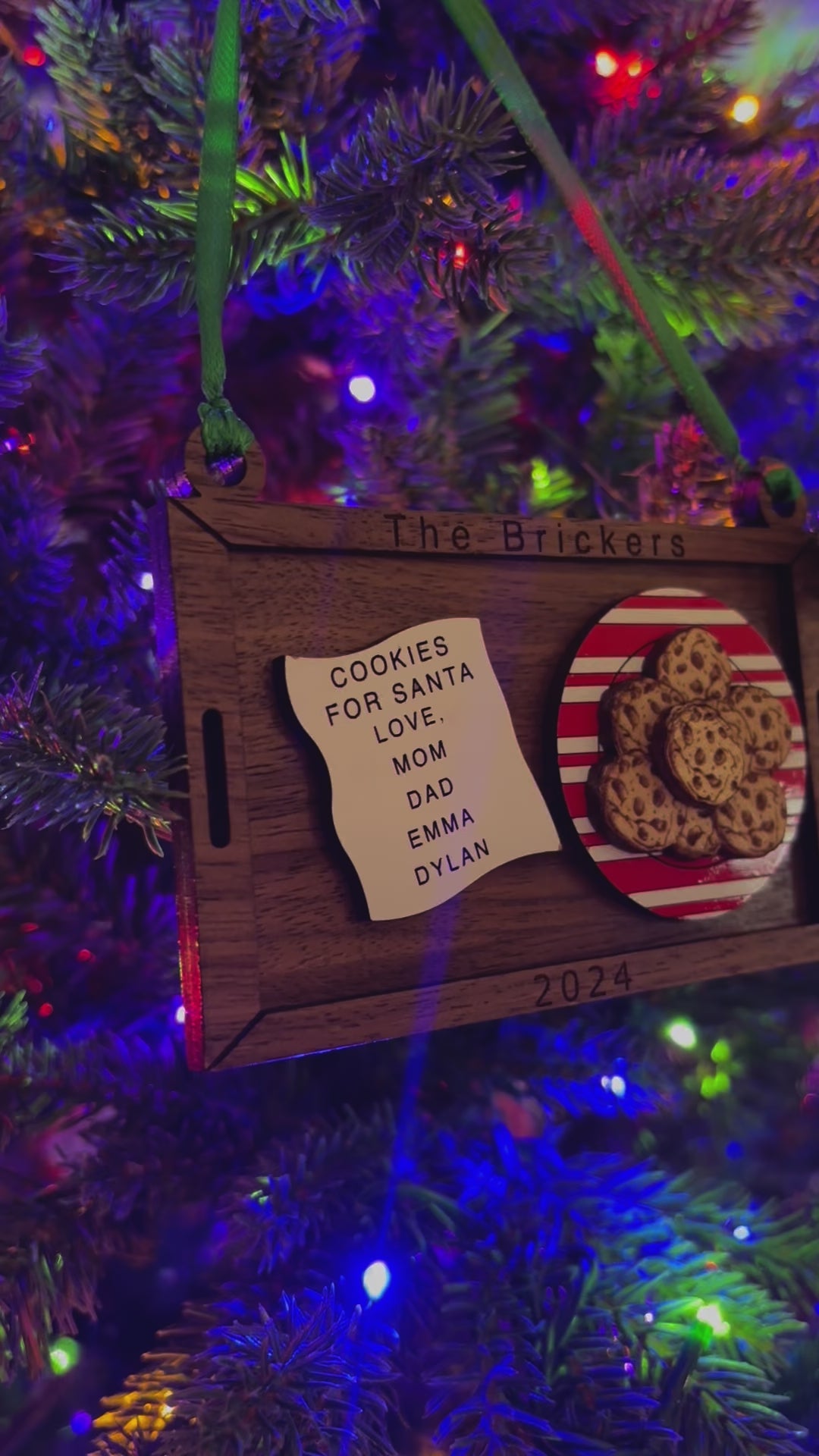 - The walnut wood backer is cut through and engraved to accentuatte the handles. The frame is personalized with the family name engraved on top, and the year engraved on the bottom. This can all be personalized. On Santas List we can add all the family names and the cookies sit 2 layers high on top of the candy cane themed plate.