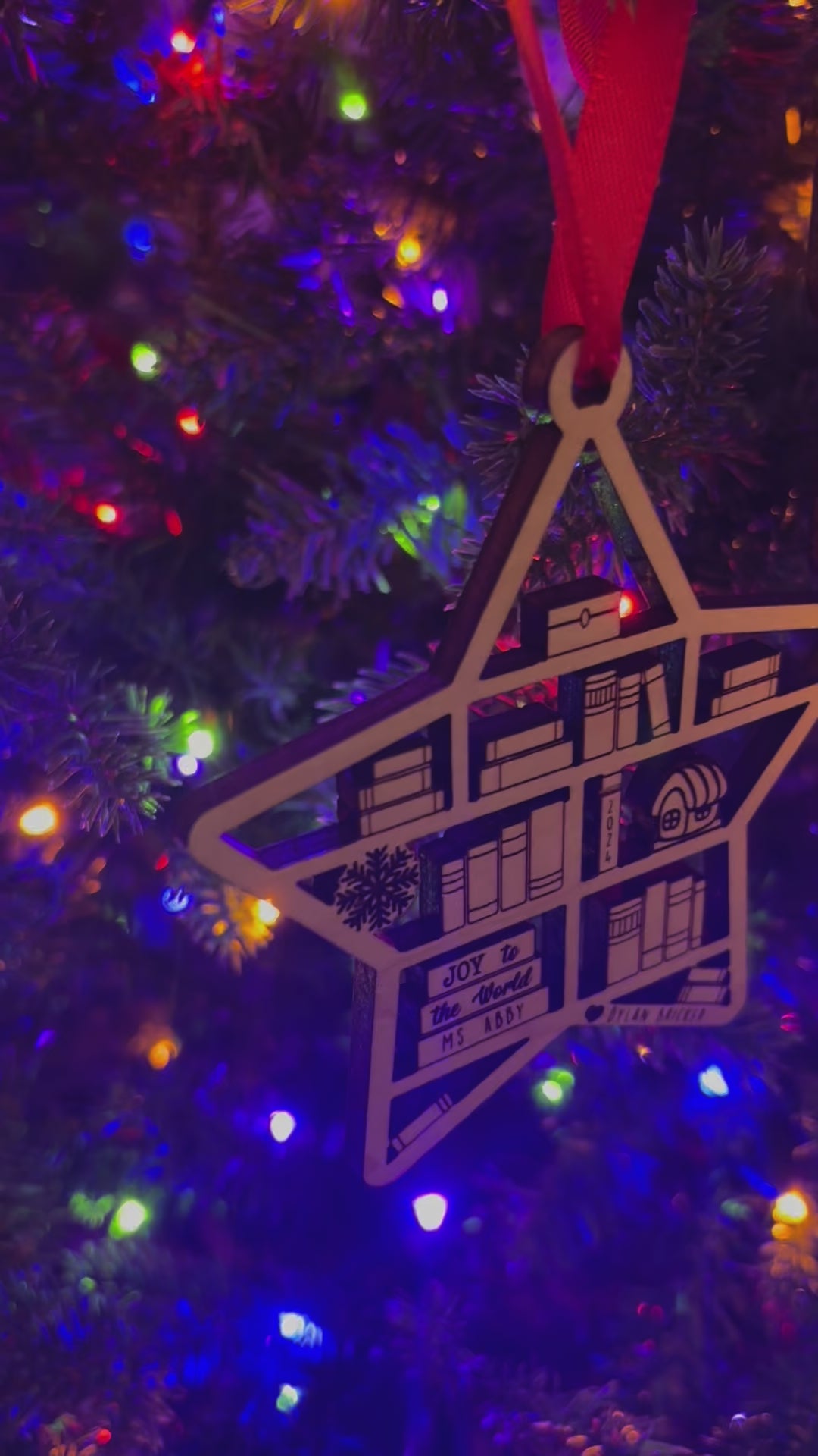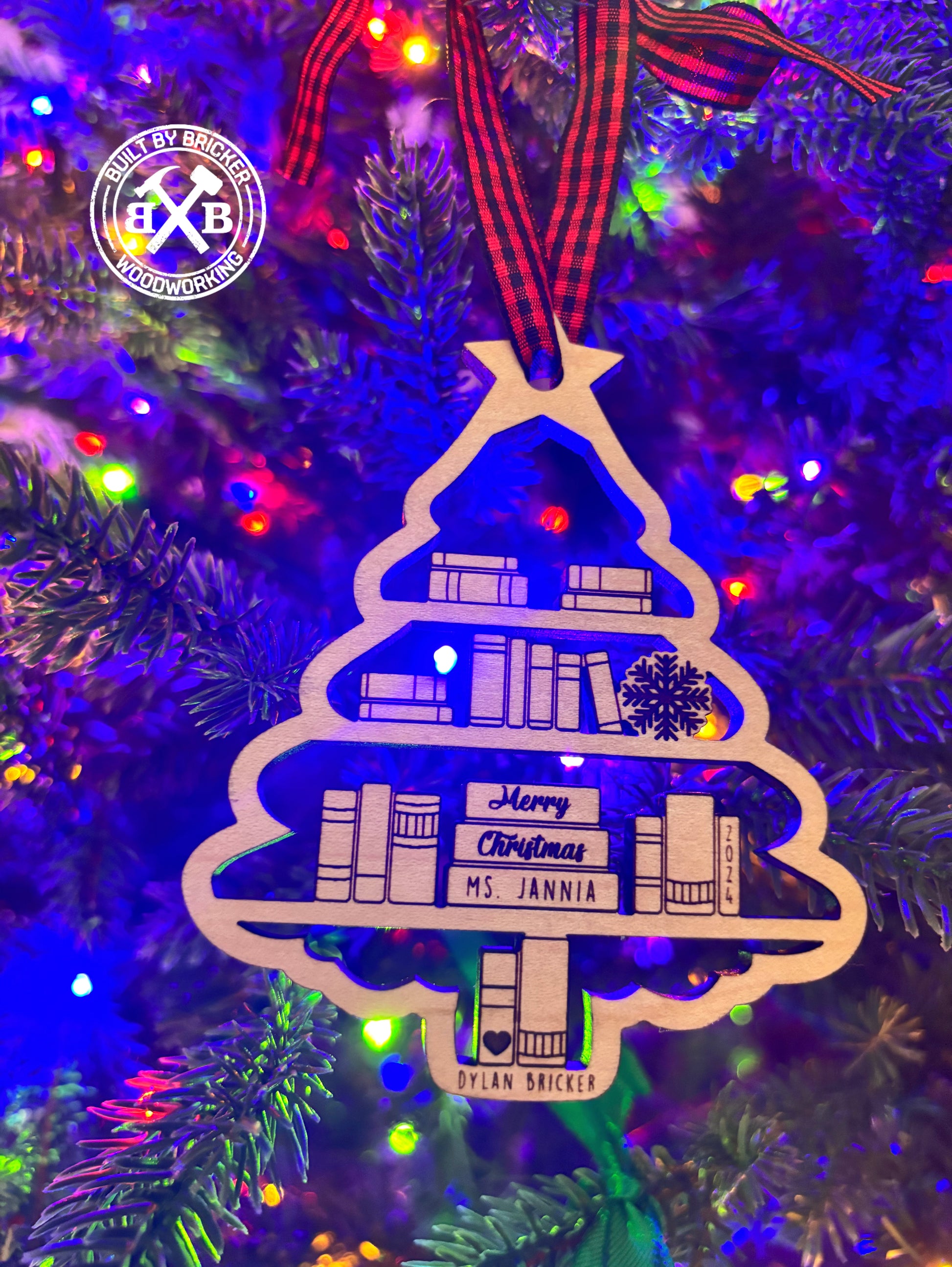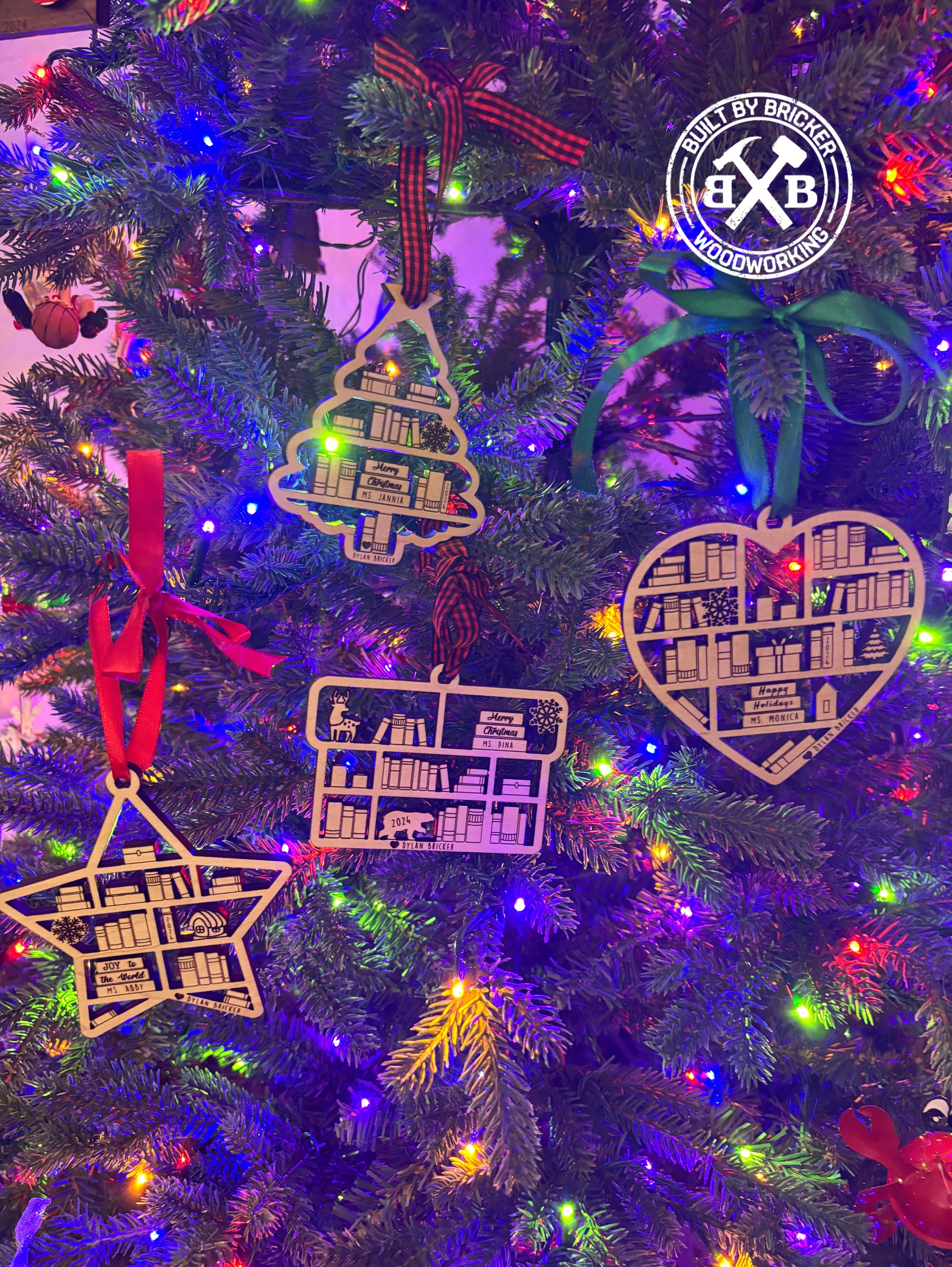 Nothing says thanks for taking care of my snotty kids all day like a personalized ornament! (and maybe throw in a gift card!) These Bookcase Ornament's are adorable and are sure to stand out from any angle. The lights look great coming though the cutouts. We have multiple designs available, take a look though the images.