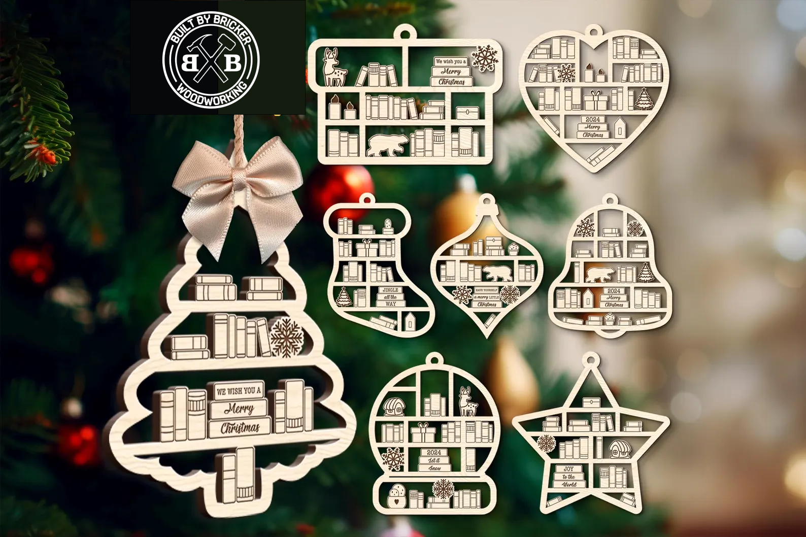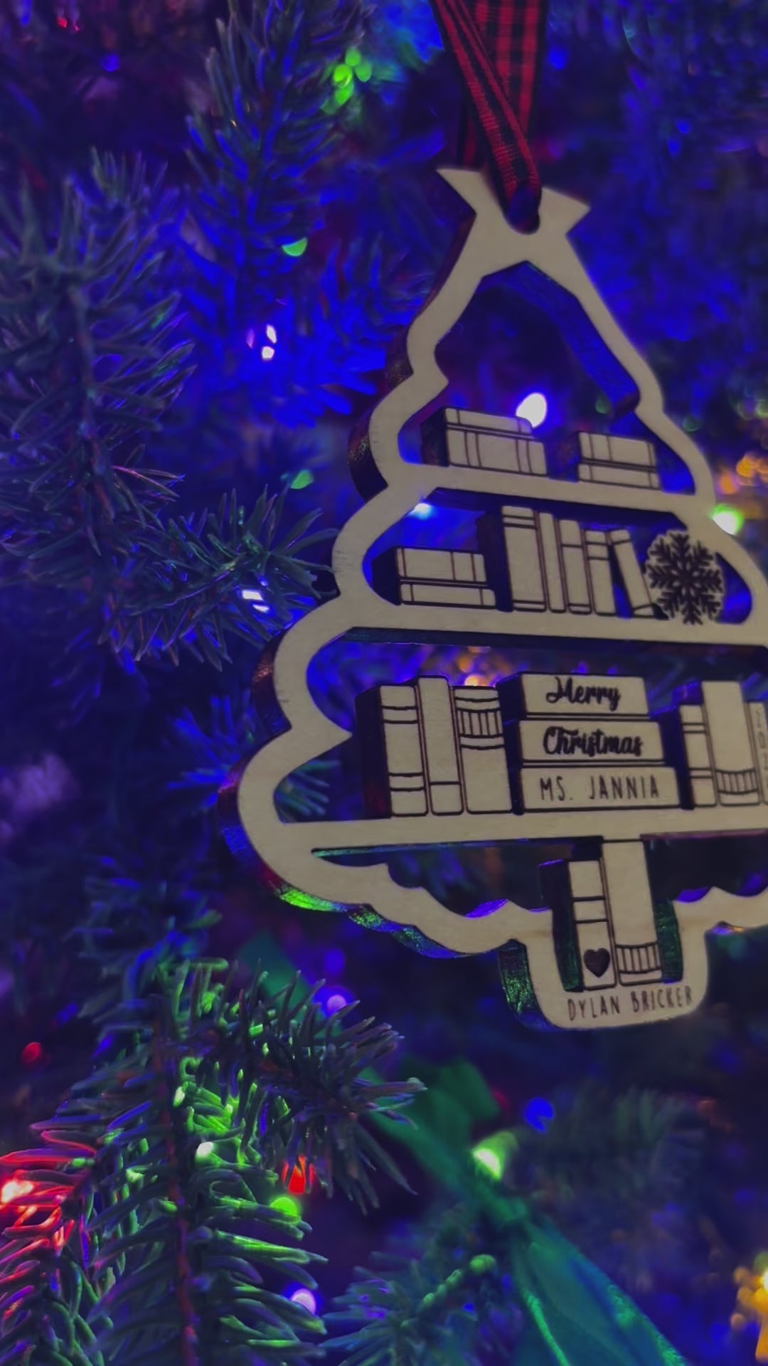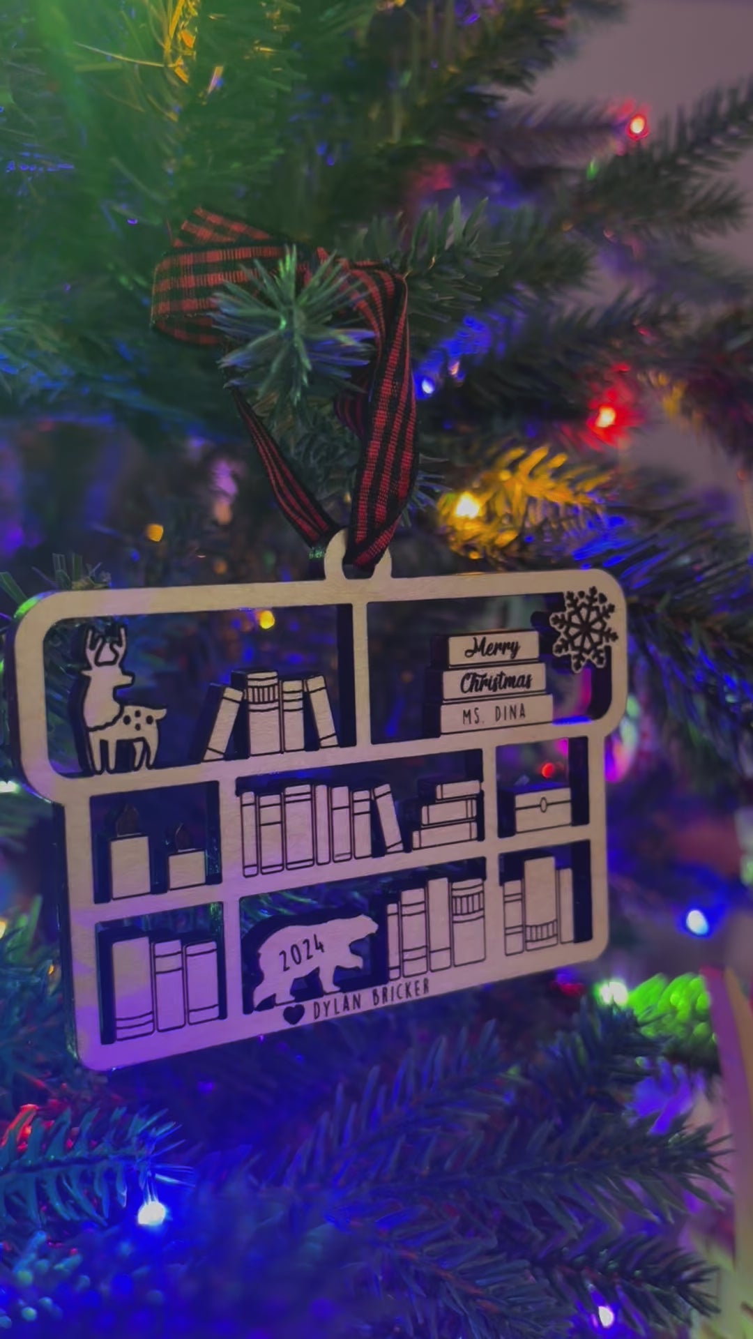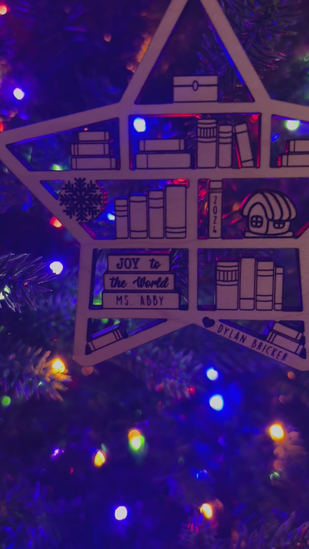 Nothing says thanks for taking care of my snotty kids all day like a personalized ornament! (and maybe throw in a gift card!) These Bookcase Ornament's are adorable and are sure to stand out from any angle. The lights look great coming though the cutouts. We have multiple designs available, take a look though the images.