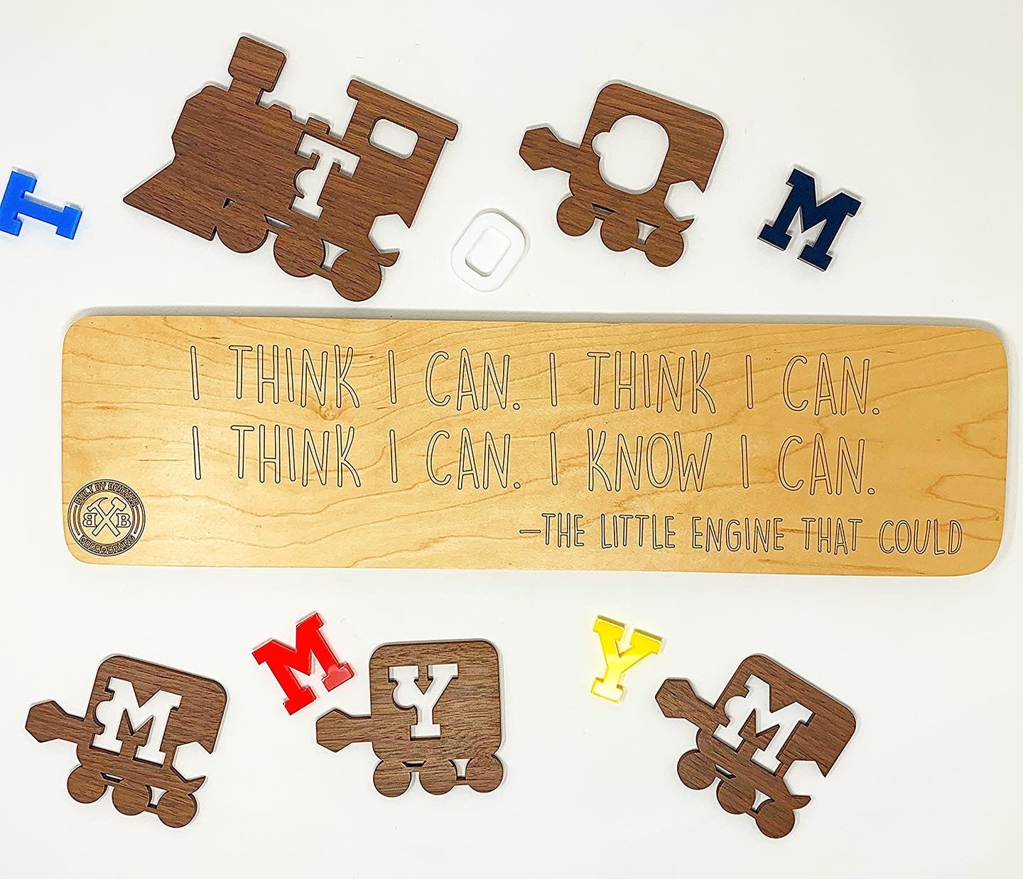 - In order to assist the little ones with removing the pieces, there are thumb cut outs in the walnut train pieces as well as we made the colored acrylic pieces at twice the thickness (1/4" vs 1/8") than the walnut.