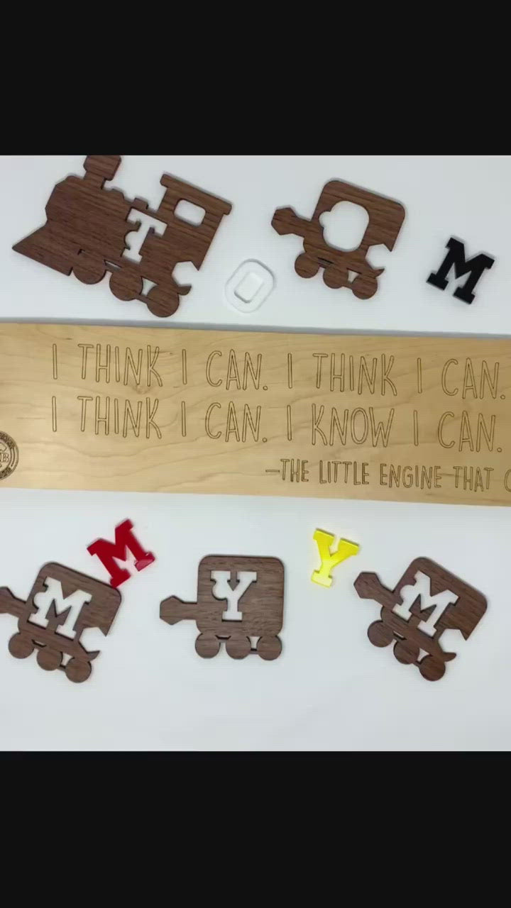 - This custom name puzzle is made from two layers of maple plywood (bottom layer is 1/4" and the top layer is 1/8"). The train is made from 1/8 " walnut plywood and the letters are made from 1/4" colored acrylic. The overall size of the puzzle will depend on the length of the name, but is roughly 18" long by 6" tall.